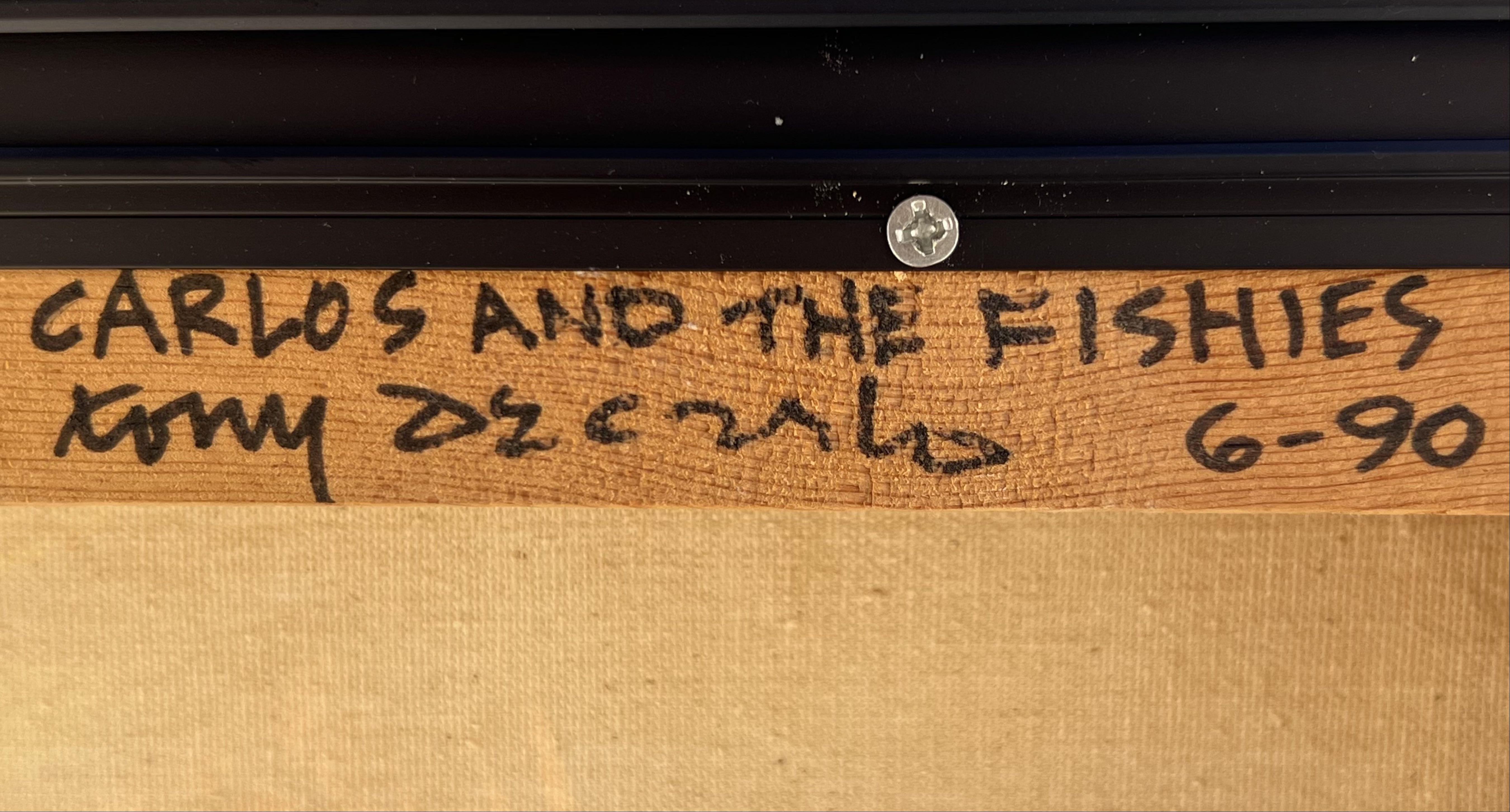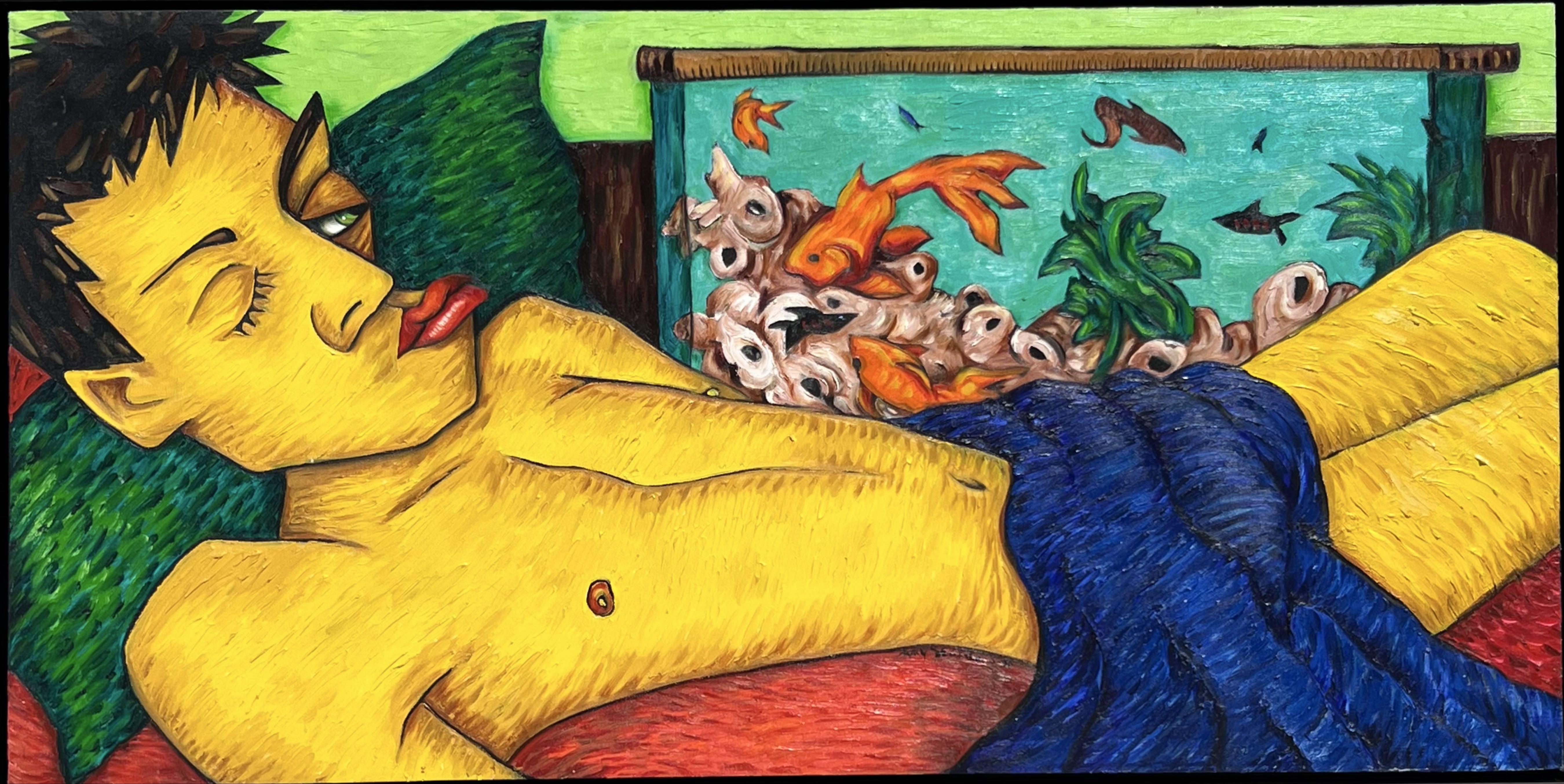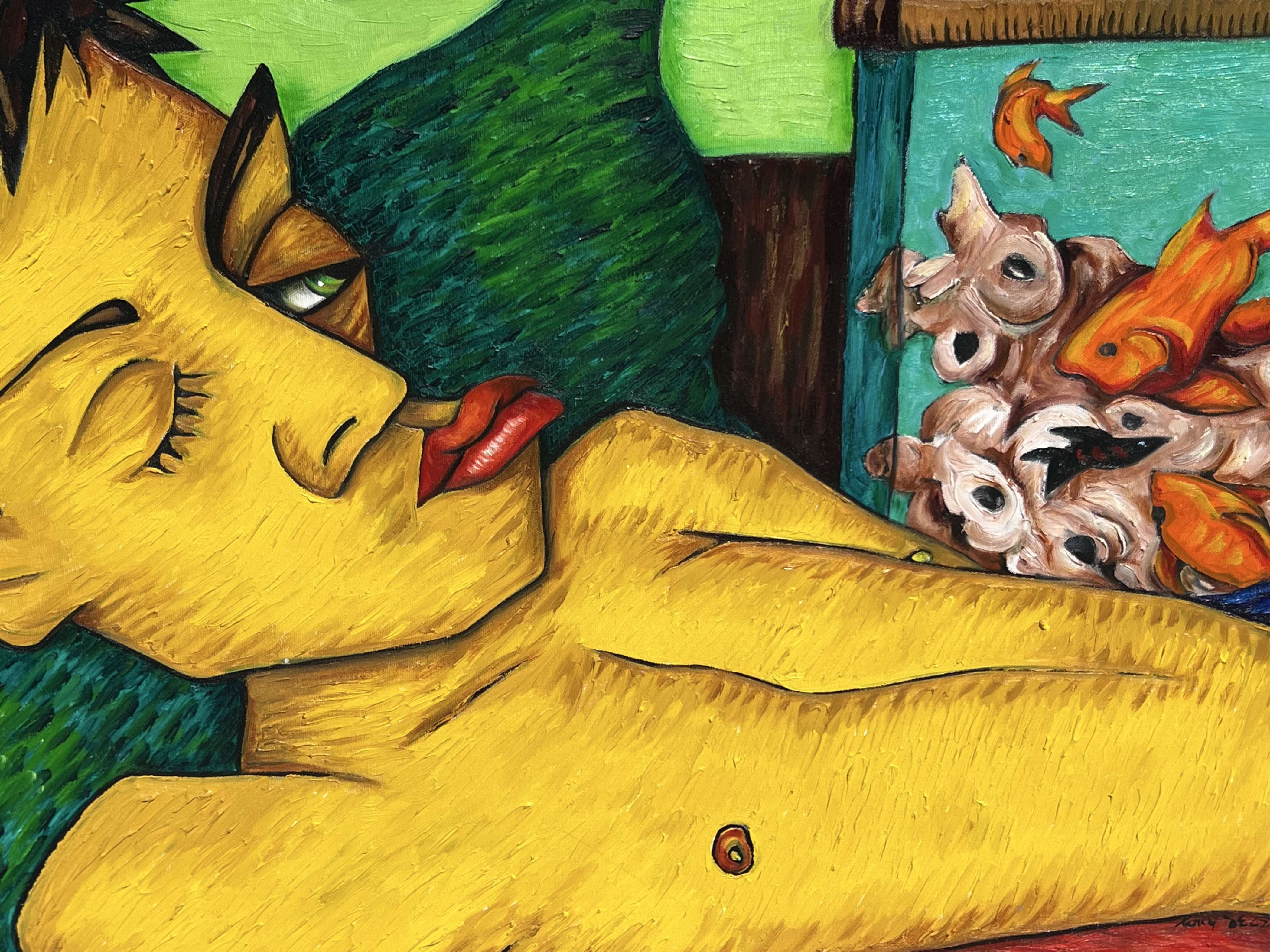 A vibrant expressionist painting depicting a reclining figure with striking yellow skin and red lips. The subject, Carlos, is juxtaposed with a fish tank containing goldfish and a surreal cluster of pale, eye like creatures, creating a dreamlike and psychologically charged scene. The artist employs a bold color palette and strong, angular lines to define the form.