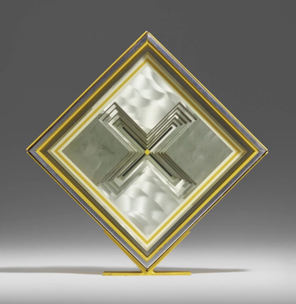 This geometric sculptural work by Tony Delap exemplifies the artist's signature exploration of optical illusion and spatial ambiguity. Executed in 1968 during his pivotal period in the California Light and Space movement, the diamond-oriented piece features concentric frames in gold and silver tones surrounding a cross-shaped central element. The interplay of reflective surfaces, transparent glass, and enameled metals creates a dynamic visual experience that shifts with viewer perspective.