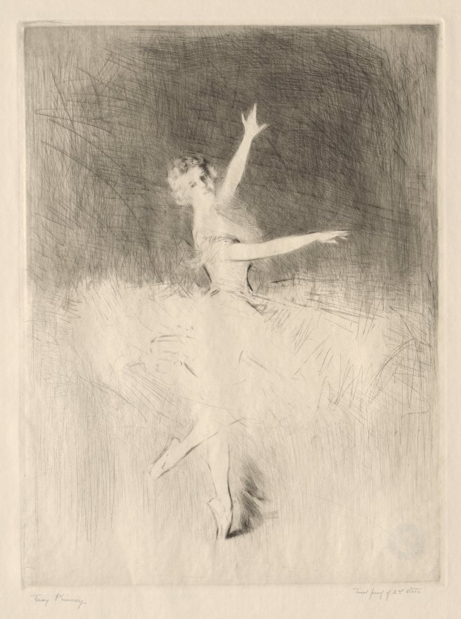 Portraying the famous Danish ballerina at the height of her career, this work combines etching and drypoint techniques to render the ethereal quality that made Génee a legendary figure in early 20th-century dance.