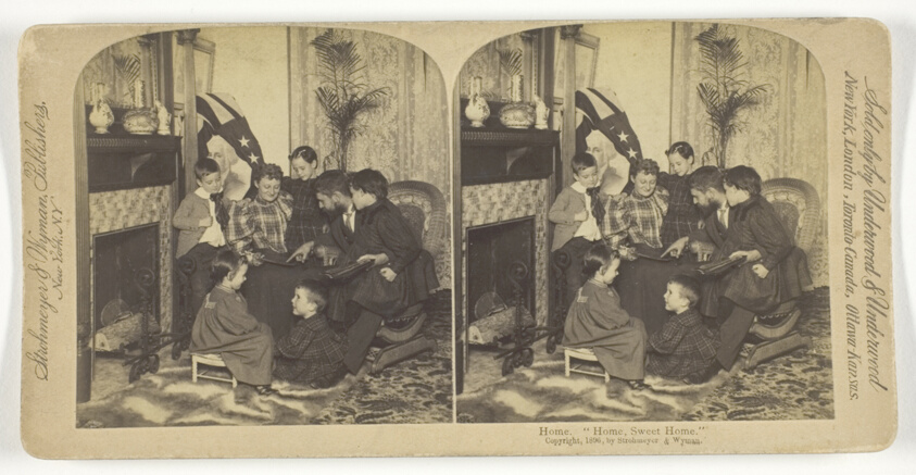 Embodying Victorian domestic ideals through the popular medium of stereoscopic photography, this image transforms a simple interior scene into a three-dimensional celebration of hearth and home.