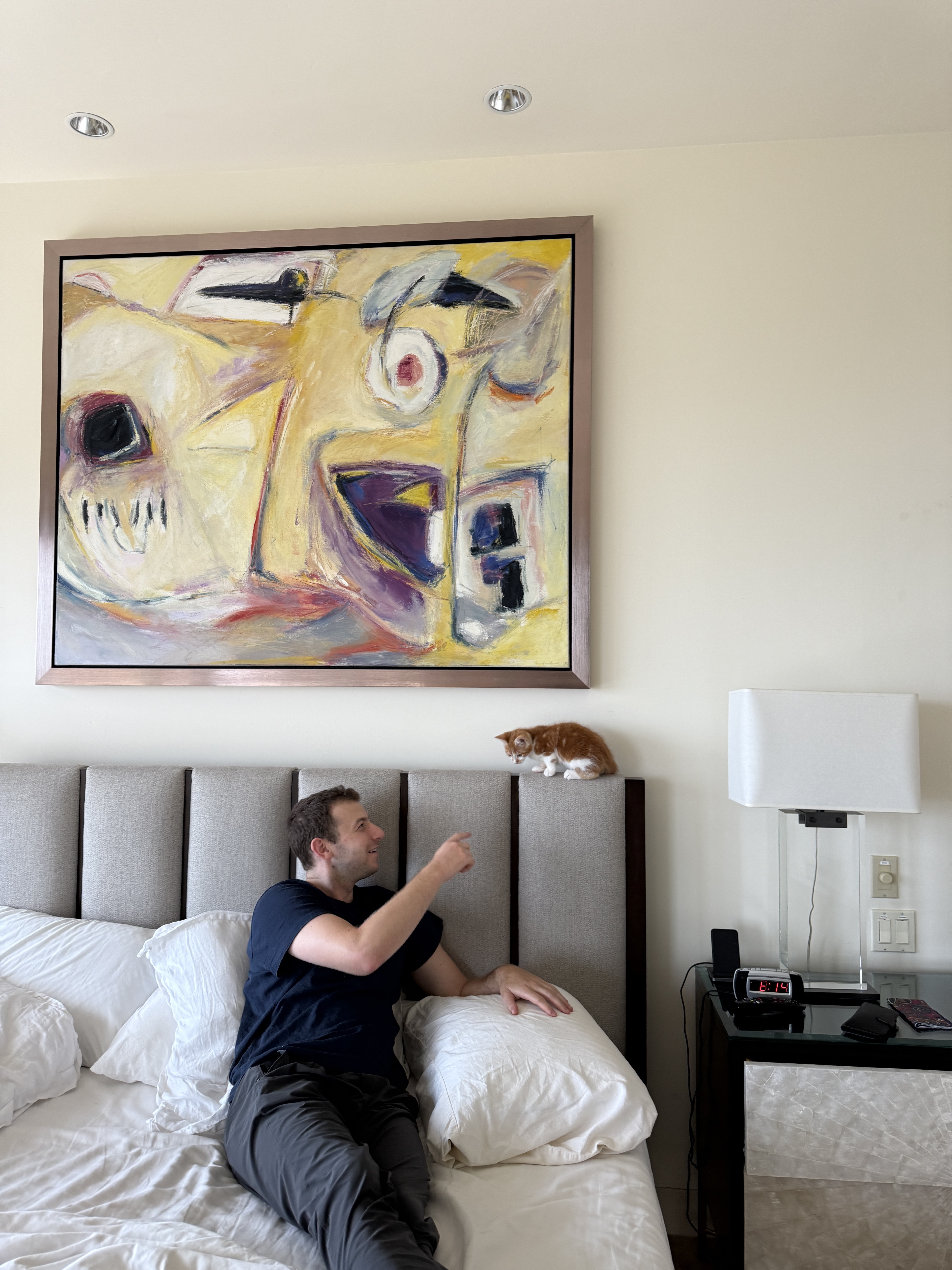 Work is displayed in a residential bedroom setting, hung above a bed. Framed in a bronze/copper-toned floater frame. An orange-and-white kitten and a man are visible in the photograph. Digital clock on nightstand reads 8:14. No documents, receipts, certificates, or invoices were provided — all data derived from visual analysis only.