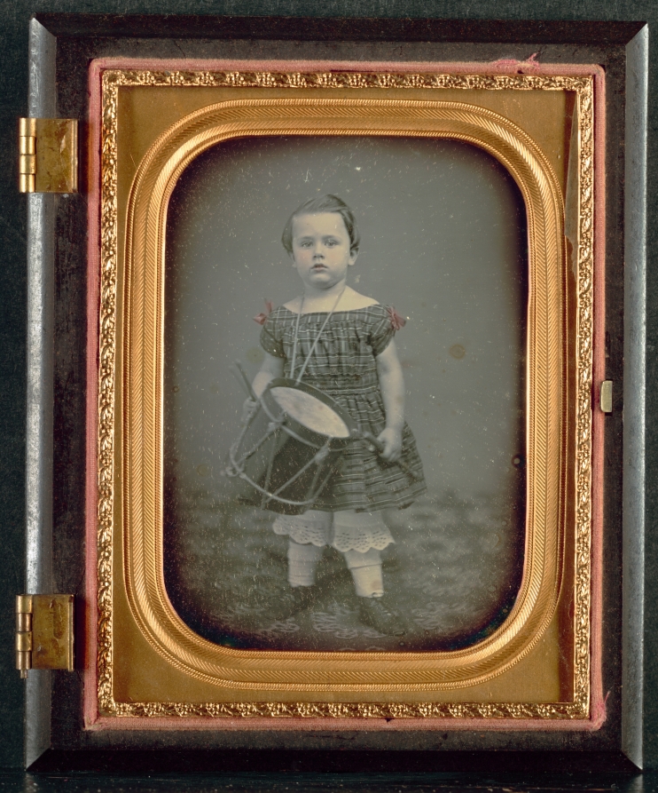 Positioned with a toy drum, this child's portrait demonstrates early photography's adoption of prop-based composition to create engaging and characterful images.