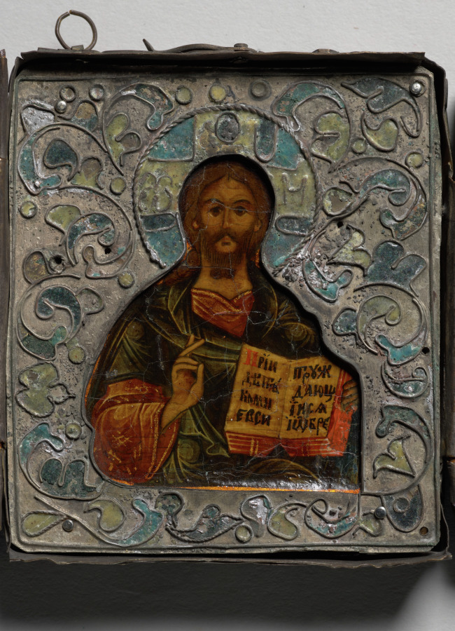 Part of a cloisonné enamel triptych, this Christ figure demonstrates the Russian Orthodox tradition of creating intimate devotional objects with jewel-like precision and luminous colors.
