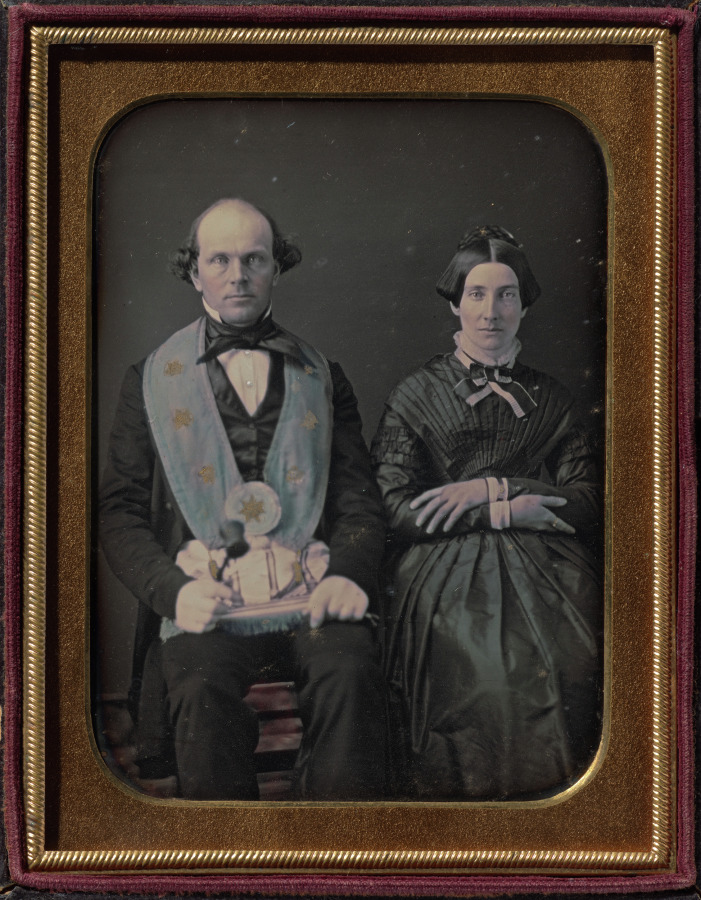 Freemasonry's prominence in 19th-century American society is evident in this carefully composed daguerreotype, which presents the lodge master's authority alongside domestic partnership.