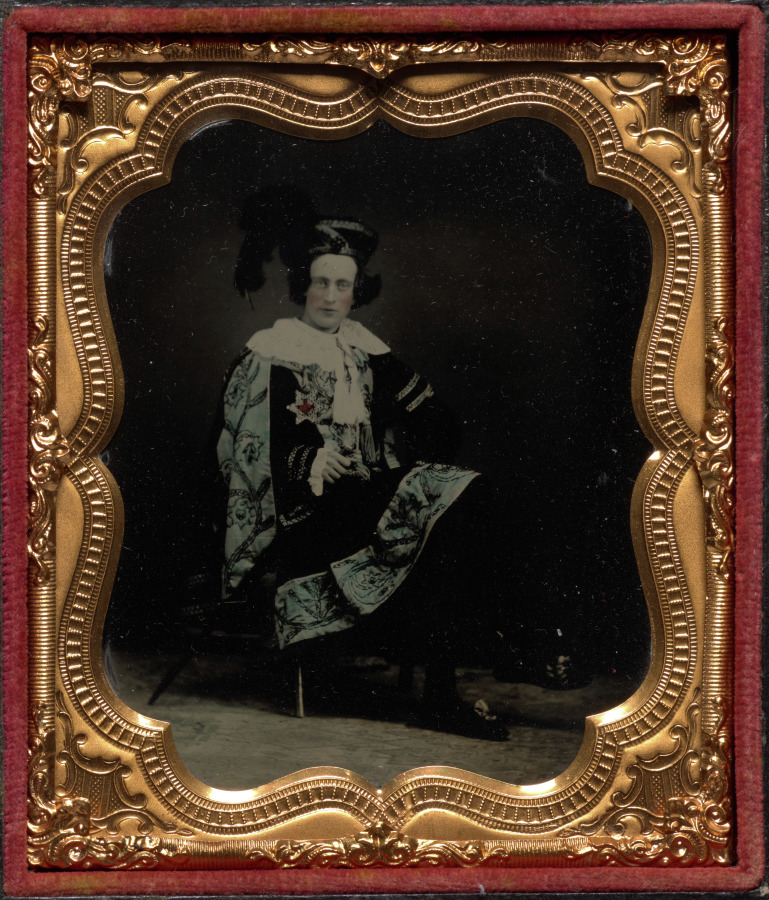 Capturing the theatrical world of the mid-19th century, this hand-tinted ambrotype preserves the dignified pose and costume details of a performer from Shakespeare's era of popularity in American theater.