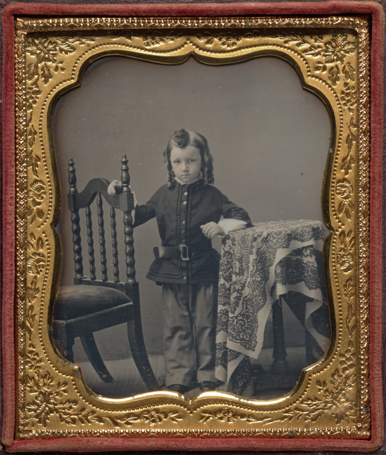 Daguerreotype's mirror-like surface perfectly captures the elaborate ringlet hairstyle popular in mid-19th century childhood fashion, creating an intimate window into Victorian domestic photography.