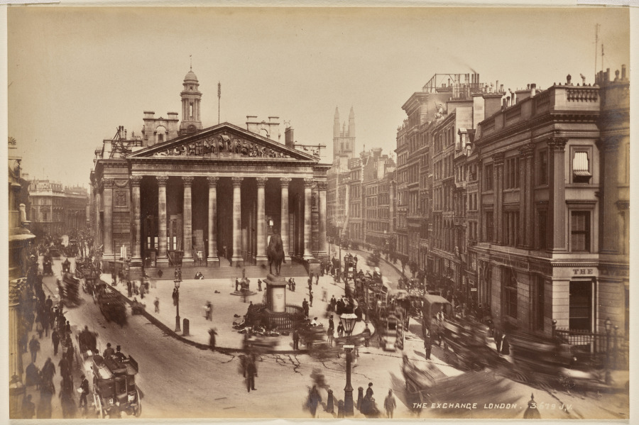 Documenting London's financial heart, this albumen print showcases photography's evolution into architectural recording and urban documentation by the 1880s.
