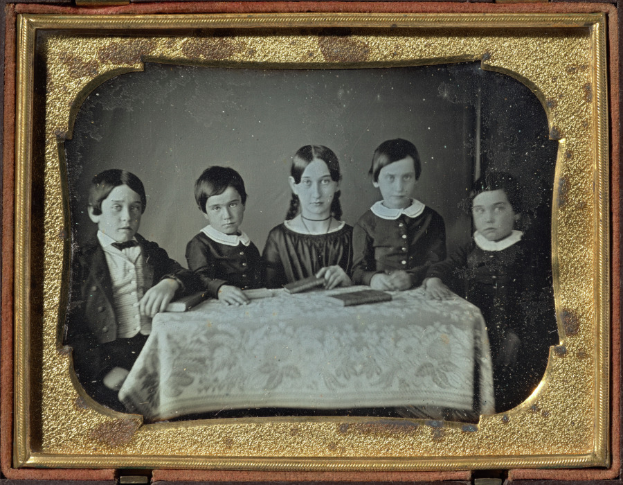 Domestic intimacy characterizes this daguerreotype scene, which captures the importance of education and family literacy during America's mid-19th century cultural development.