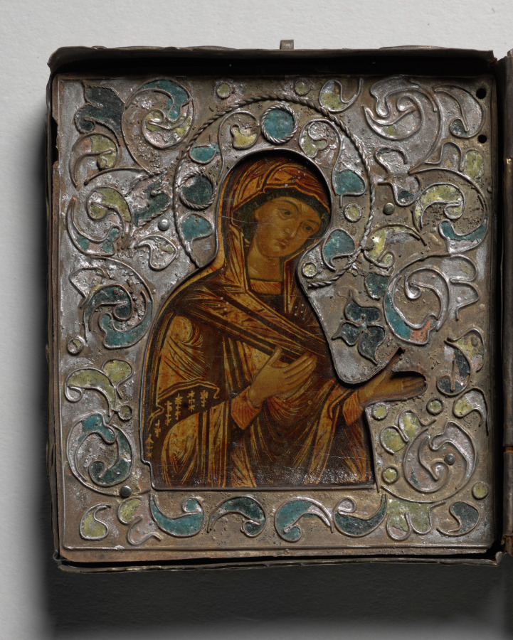 Executed in the demanding cloisonné enamel technique, this Virgin panel showcases the Byzantine artistic heritage preserved in 19th-century Russian religious art.
