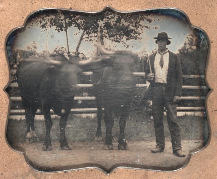 Despite its small sixth-plate format, this daguerreotype captures the essential partnership between man and beast that drove 19th-century agricultural life.