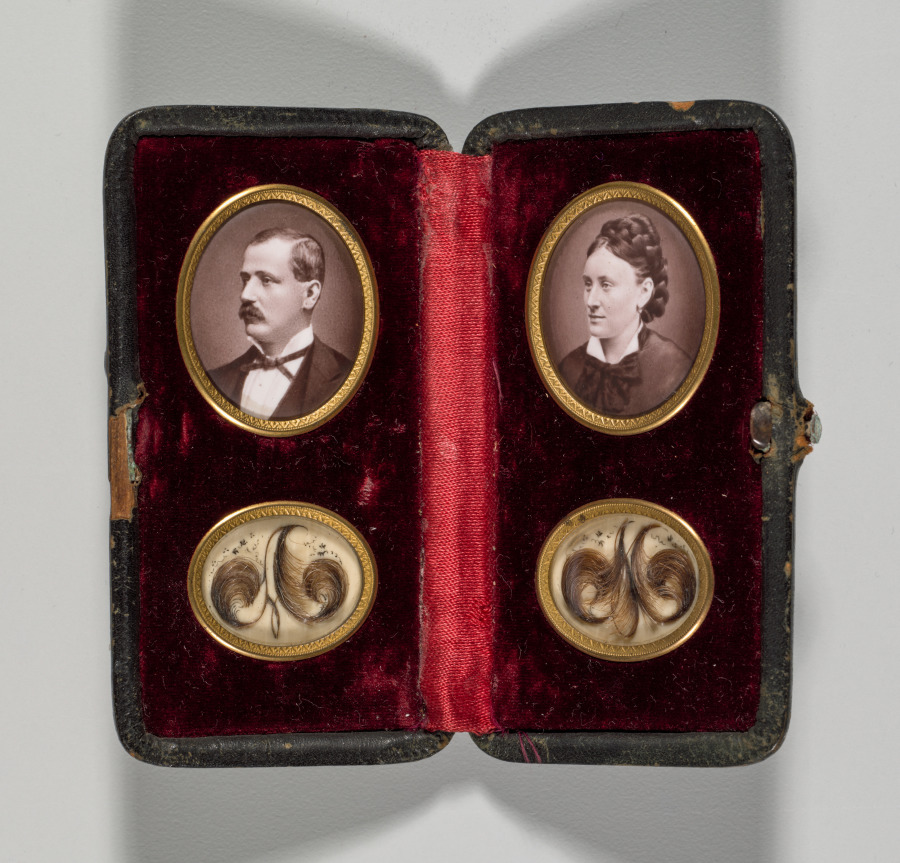 - Photographs: photographs on enamel, framed in copper alloy metal frames; hair lockets: hair with pen and black and ink on cream-colored backing; case: leather with metal push-clasp and velvet-lined interior
