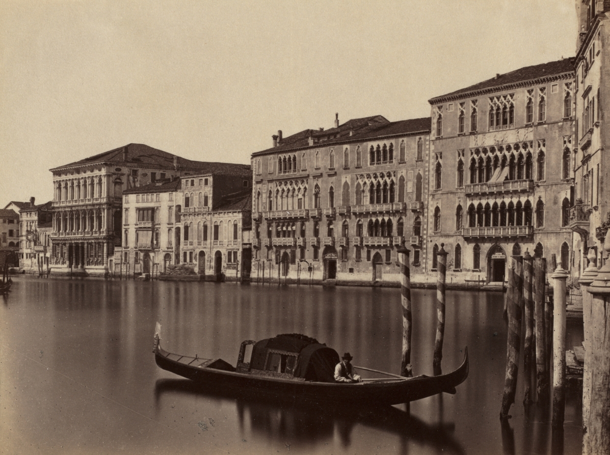 Venice's iconic waterways became a favorite subject for early travel photographers, with this albumen print capturing the romantic appeal that drew countless visitors to the floating city.