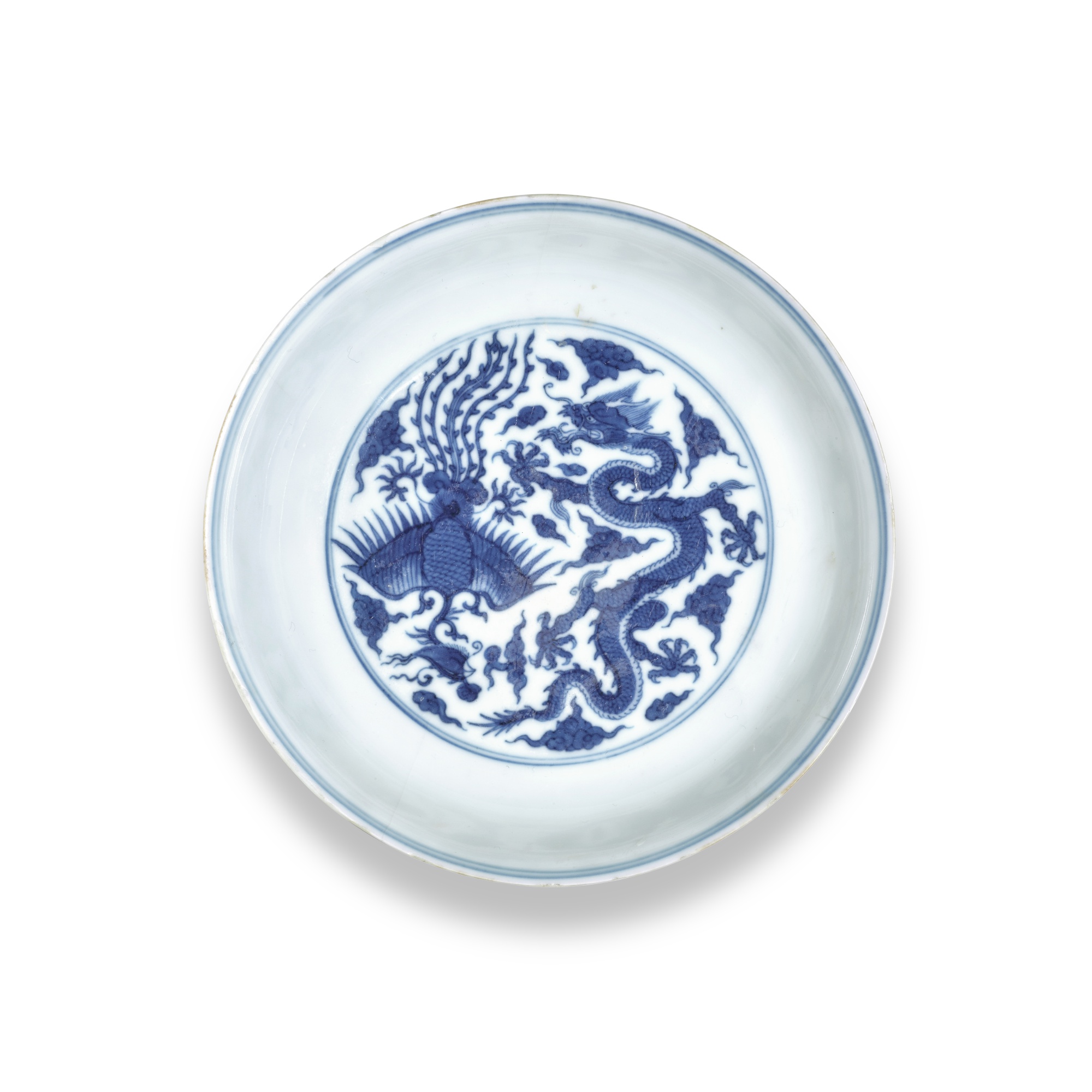 A blue and white ‘dragon and phoenix’ dish, Mark and period of Kangxi