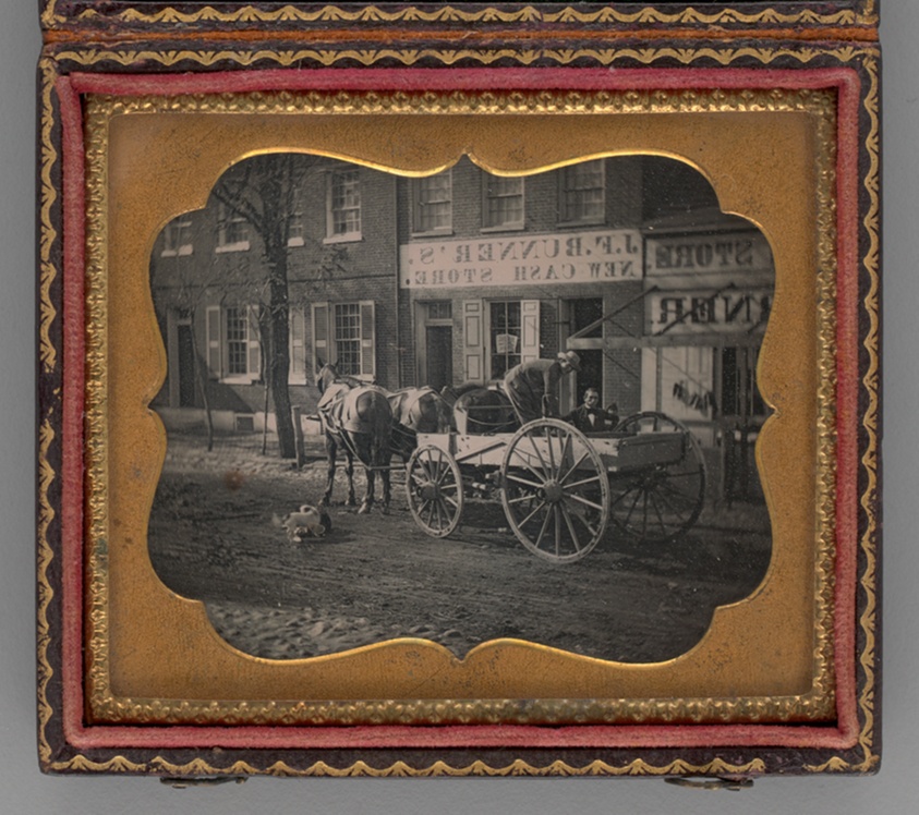 Street photography in its earliest form, this daguerreotype captures the rhythm of mid-19th century urban life. The spontaneous quality, unusual for daguerreotypes, provides insight into daily transportation and city dynamics.