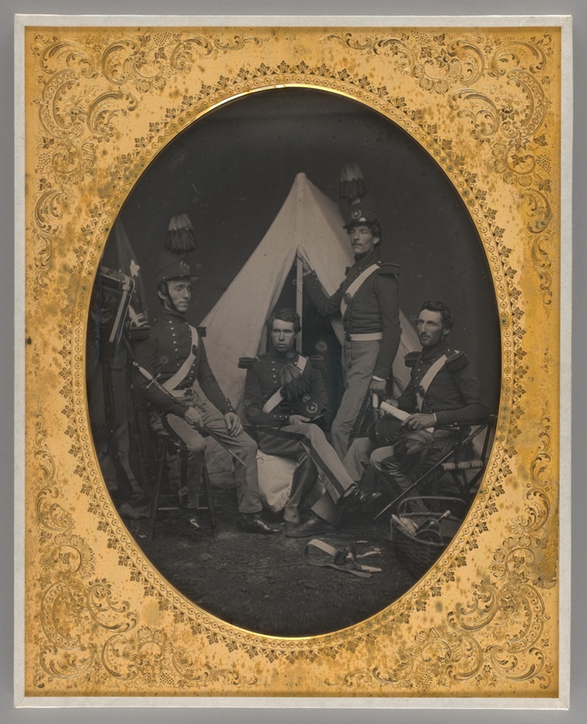 Military portraiture flourished during the 1850s, and this daguerreotype captures New York militiamen in their formal uniforms, reflecting photography's role in documenting American military identity before the Civil War.