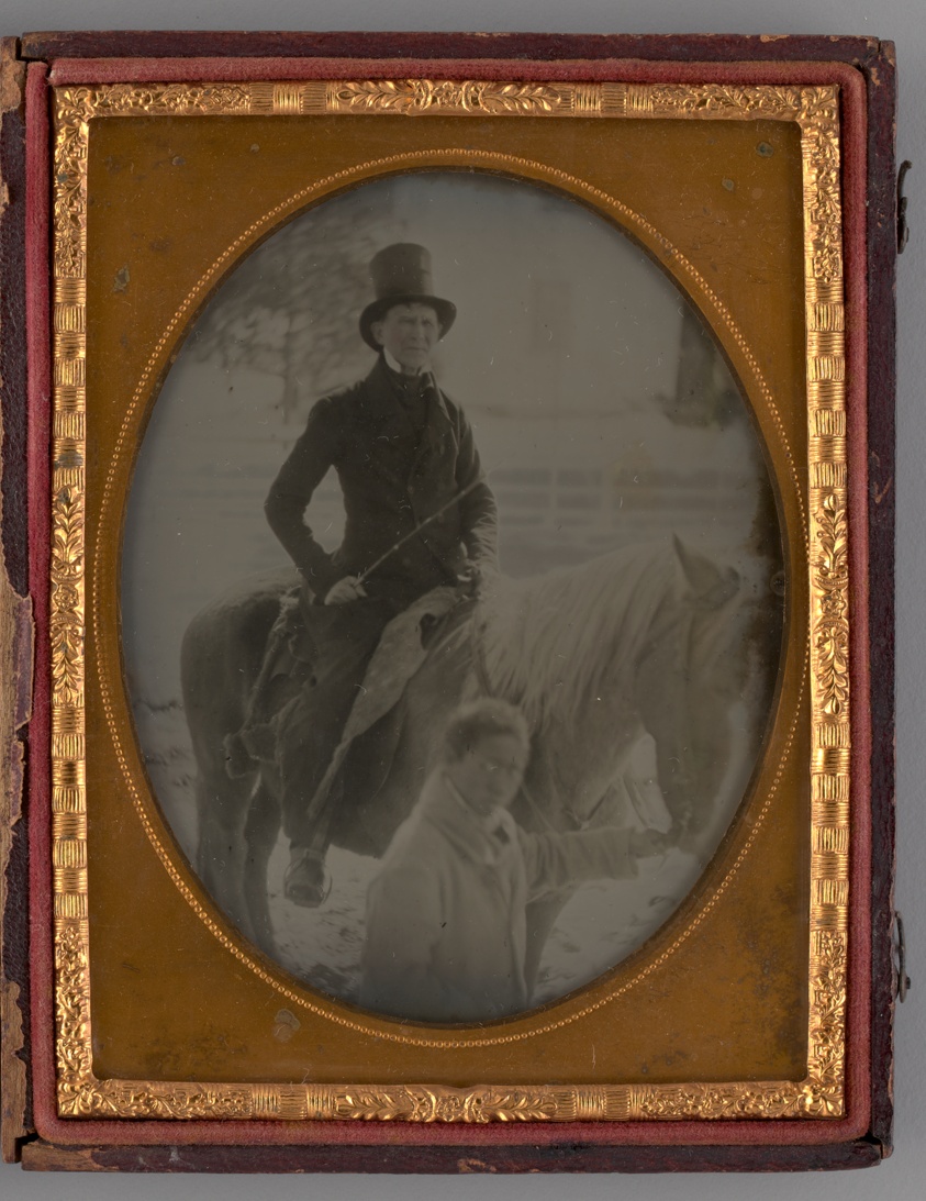 Equestrian portraiture in early photography required exceptional skill due to long exposure times, making this clear ambrotype a technical achievement.