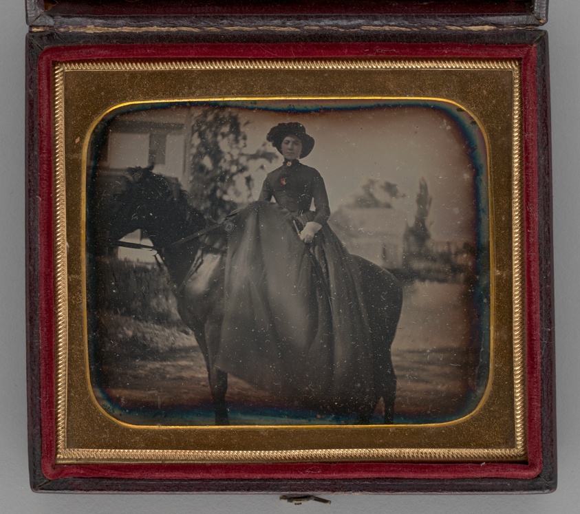 Among the earliest photographic portraits to capture equestrian subjects, this daguerreotype demonstrates the technical challenges of photographing movement in the medium's infancy. The crisp detail and formal composition reflect the daguerreotype's capacity for rendering fine textures and social status symbols.