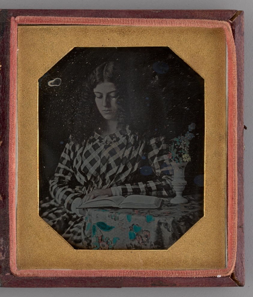 Exceptionally rare for its intimate subject matter, this early daguerreotype captures a moment of private literacy that speaks to women's intellectual engagement in the mid-19th century.