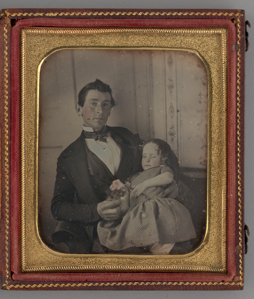 A tender scene of paternal care unfolds in this daguerreotype, where a father holds his young daughter in an intimate pose that reveals the medium's power to preserve fleeting family moments.