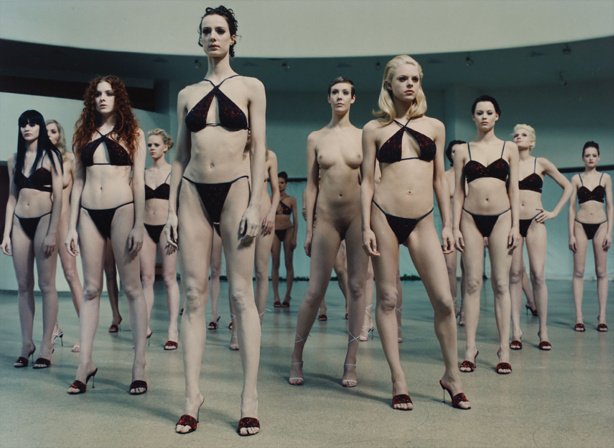 A group of nearly nude women stand in rigid, statuesque formation within the iconic spiral rotunda of the Solomon R. Guggenheim Museum, their bodies arranged as living sculptures against the museum's stark white architectural curves. Beecroft orchestrates themes of voyeurism, feminine identity, and spectacle, blurring the boundary between art object and human subject. The chromogenic print preserves the performance's haunting tension between uniformity and individuality, transforming the female body into both medium and message.