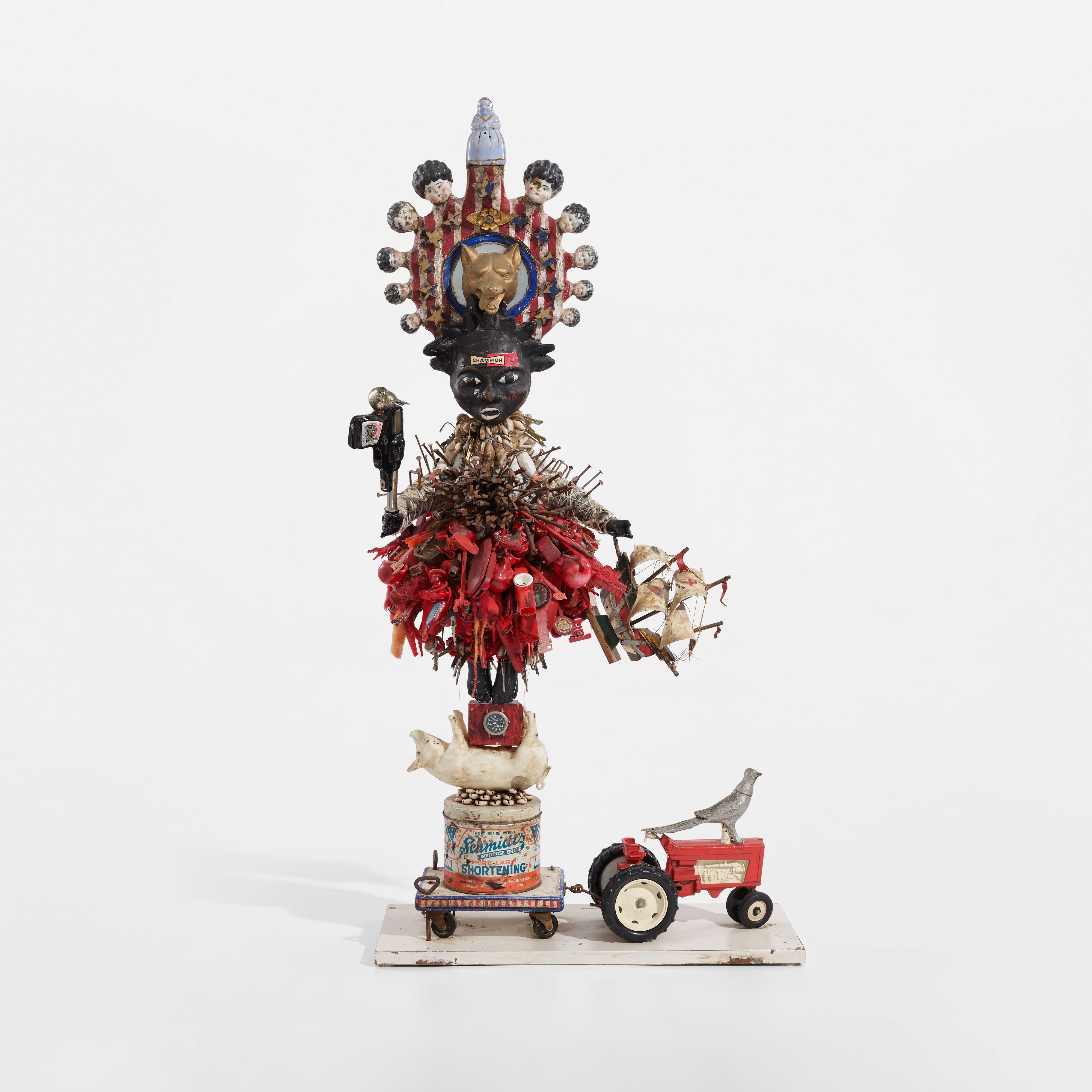 "Prize Winner" by Vanessa German is a richly assembled mixed-media sculpture that brings together an eclectic array of found objects, toys, and everyday materials to create a layered visual narrative. Vintage doll parts, old German doll heads, cowrie shells, and folk figurines are combined with humble materials like tar, lard tins, twine, and earth, evoking themes of memory, childhood, and cultural identity. The work pulses with a raw, talismanic energy, transforming discarded and overlooked objects into a powerful monument that speaks to race, history, and the reclamation of joy.