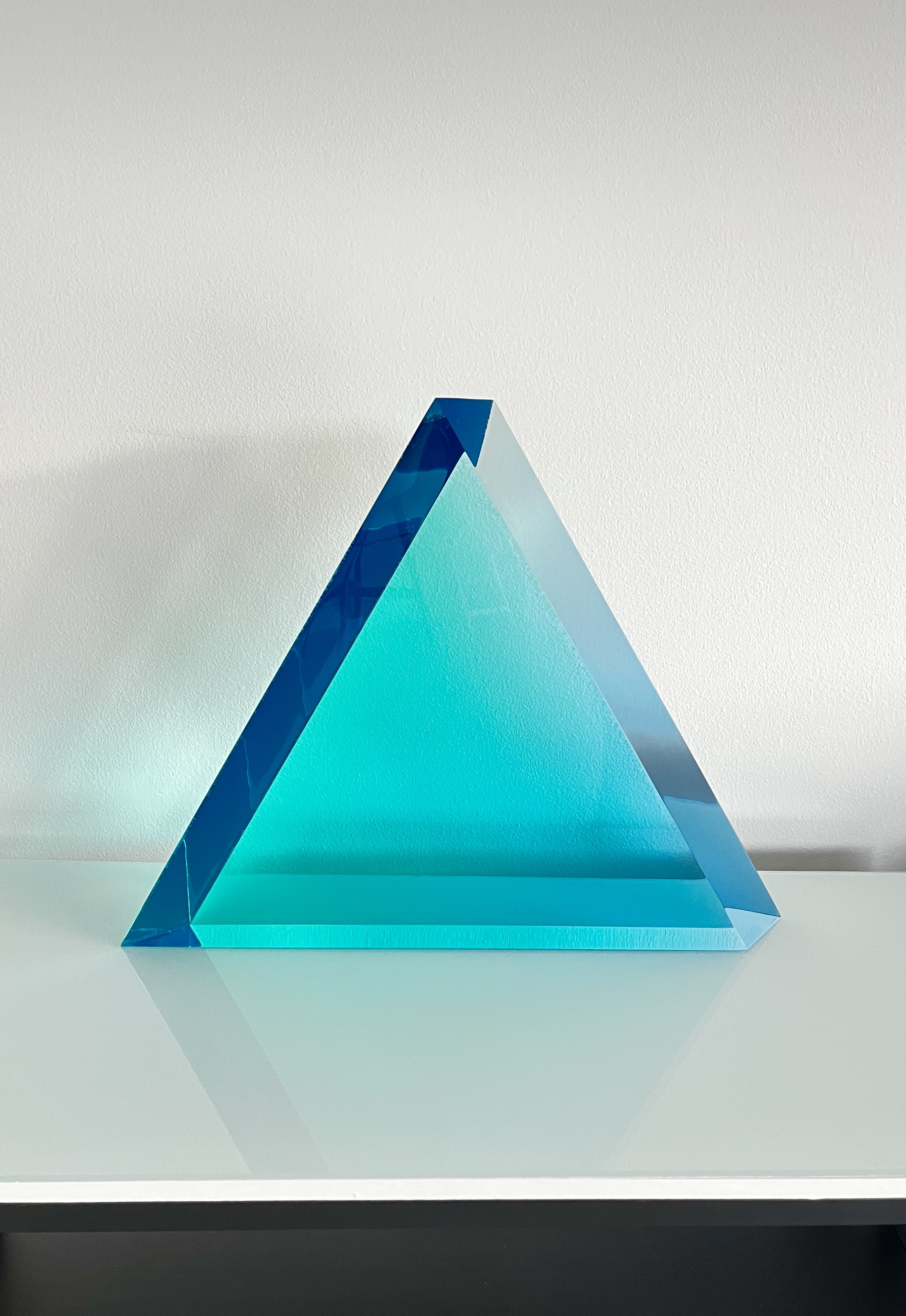 A striking geometric sculpture composed of layered laminated acrylic in graduated shades of blue and turquoise. The triangular form creates a dynamic interplay of transparency and opacity, with the translucent material allowing light to pass through and illuminate the vivid cyan interior. The clean lines and precise construction exemplify contemporary minimalist sculpture with a bold use of color and industrial materials.