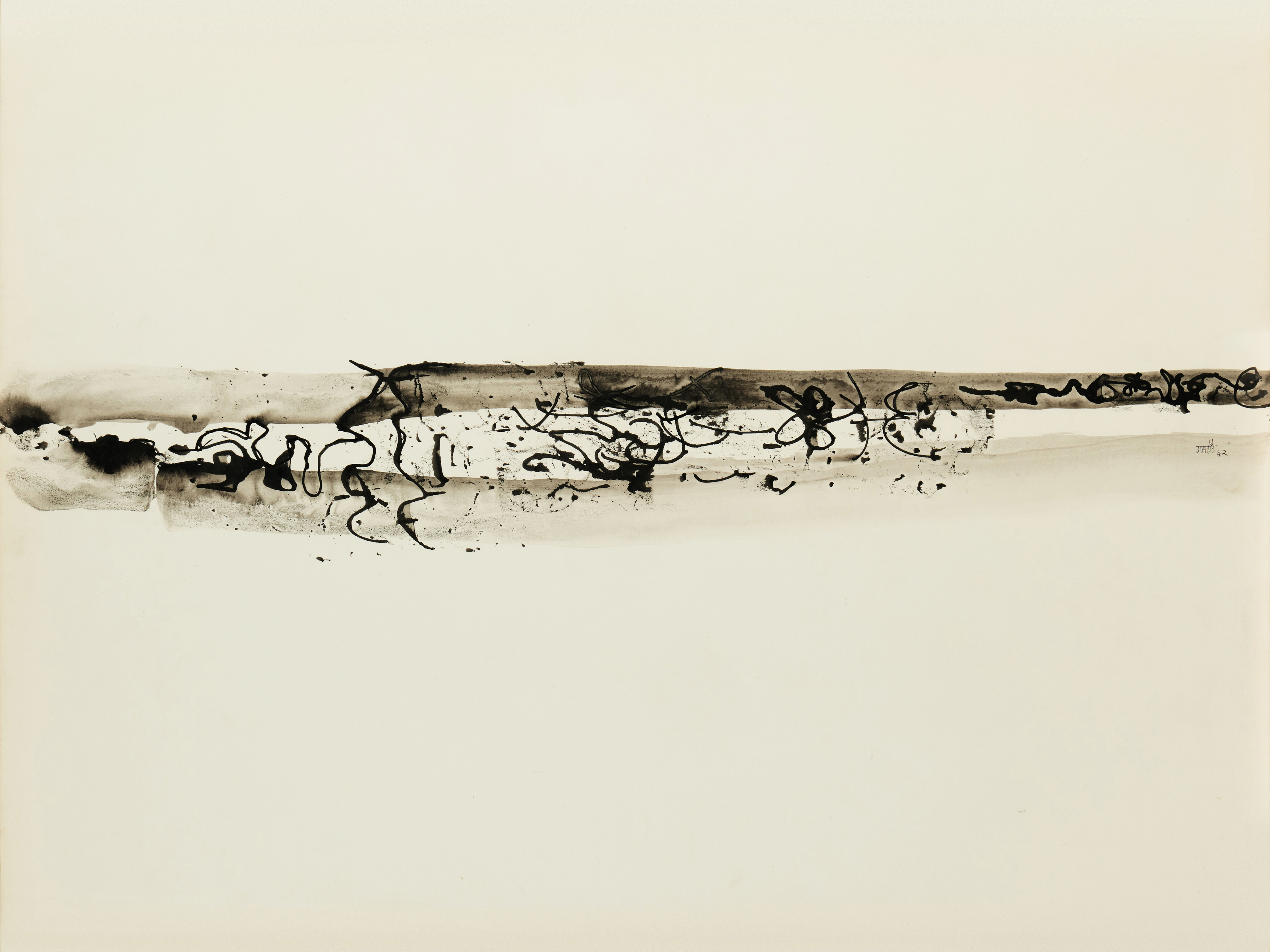 Vasudeo S. Gaitonde's untitled ink and wash work exemplifies his pioneering approach to abstraction in Indian modernism, utilizing fluid gestural marks and subtle tonal gradations to create compositions of contemplative restraint. The artist's mastery of the medium is evident in the delicate interplay between controlled brushwork and chance effects, where ink bleeds organically into dampened paper to suggest atmospheric depth without representational form. This work reflects Gaitonde's lifelong investigation into the expressive potential of minimal means, positioning ink and wash as vehicles for meditative inquiry rather than mere technical exercise.