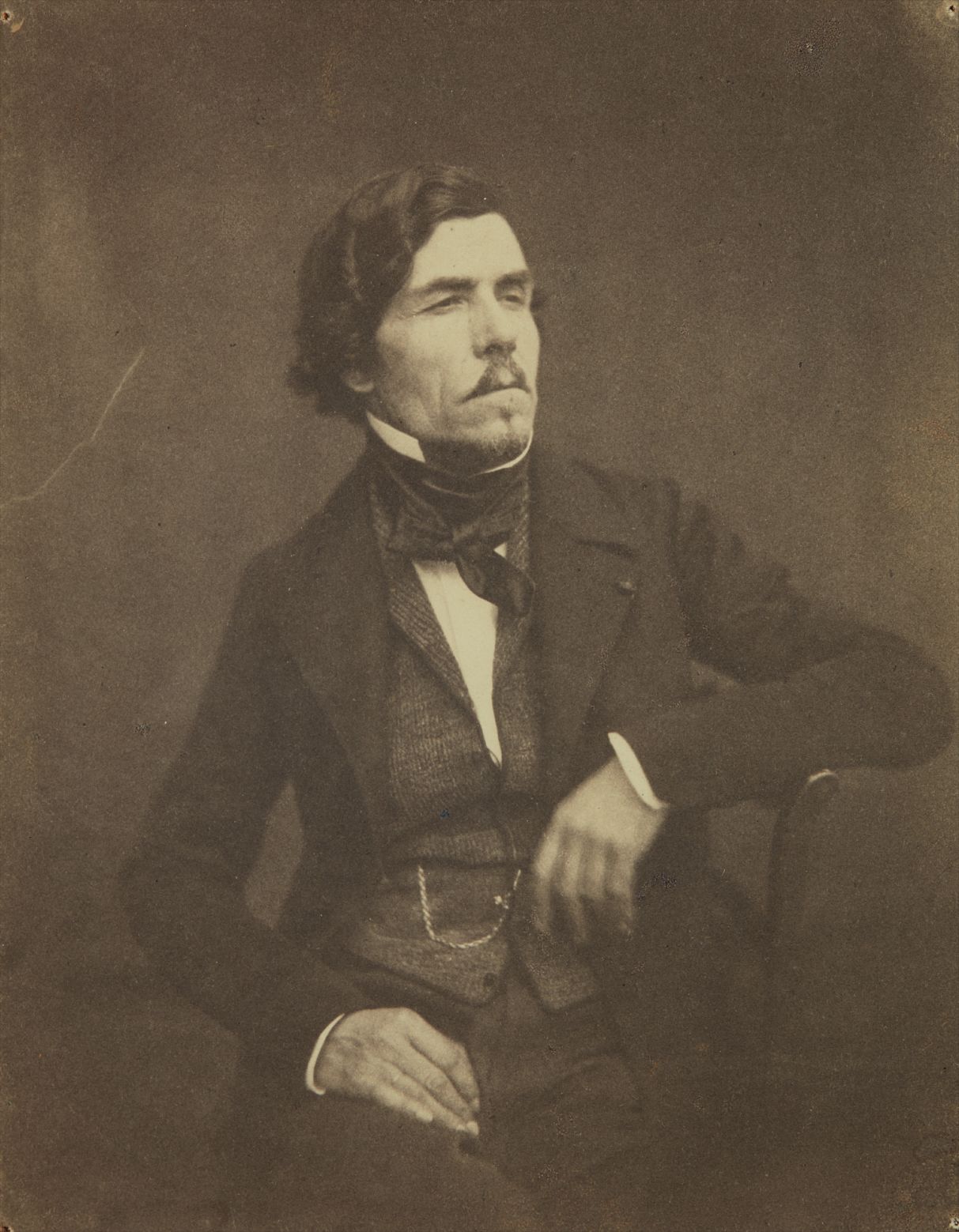 A portrait study capturing the likeness of the renowned French Romantic painter Eugène Delacroix, rendered with delicate precision by Victor Laisné. The work is identified by an inscription in an unidentified hand written in pencil on the reverse of the flush-mount, adding an element of historical intrigue to its provenance. The piece offers an intimate glimpse into the artistic circle of nineteenth-century France, preserving the image of one of its most celebrated masters.