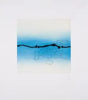 This colored etching and aquatint by Victor Pasmore exemplifies the artist's late abstract investigations into form and composition, created in 1992 when he was in his eighties. The work was printed by respected artisan Jack Shirreff in Bath and published by Marlborough Graphics in London on premium BFK Rives paper, with this being a printer's proof from an edition of 50. The substantial scale of the sheet at over 564 by 500 millimeters allows the interplay of color and gestural mark making to unfold across the composition, reflecting Pasmore's continued engagement with abstraction and spatial relationships near the end of his career.