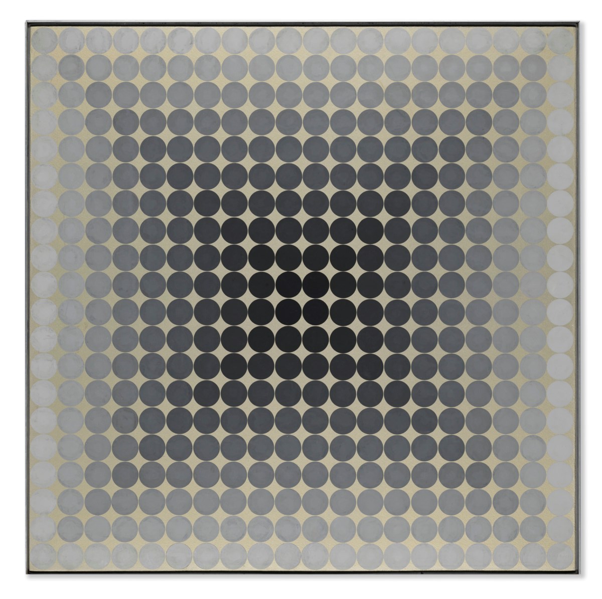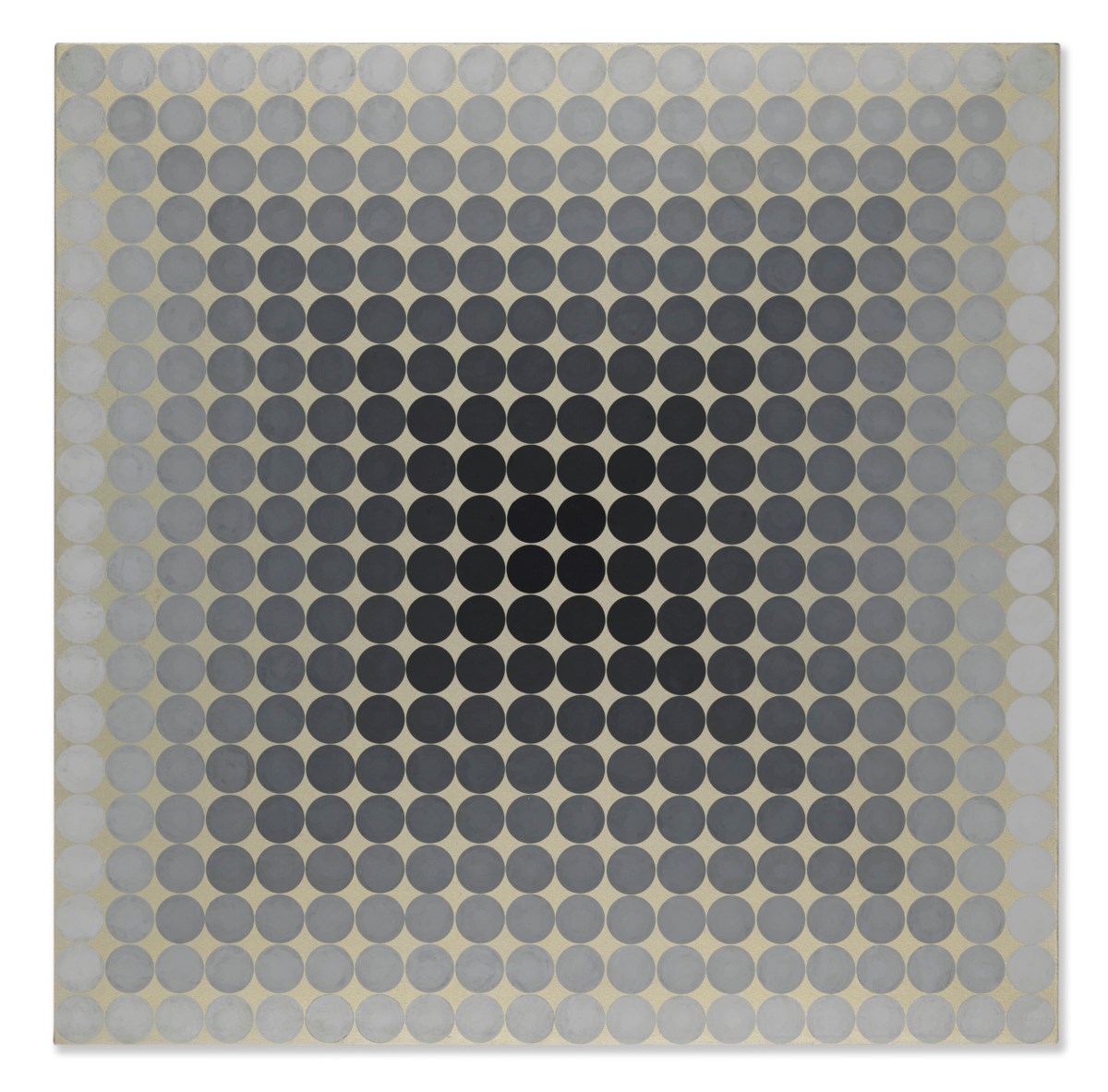 Victor Vasarely's *Cta-101* is a striking example of the artist's pioneering Op Art aesthetic, rendered in tempera on panel with precise geometric forms that create a compelling illusion of depth and movement. The work employs a carefully orchestrated interplay of shapes and contrasting colors to produce a dynamic visual rhythm that seems to pulsate and shift before the viewer's eyes. Vasarely's meticulous technique and mathematical precision transform the flat panel surface into a vibrant field of optical energy.