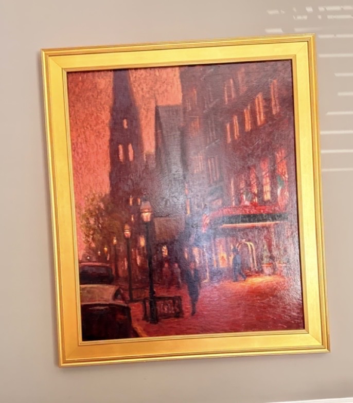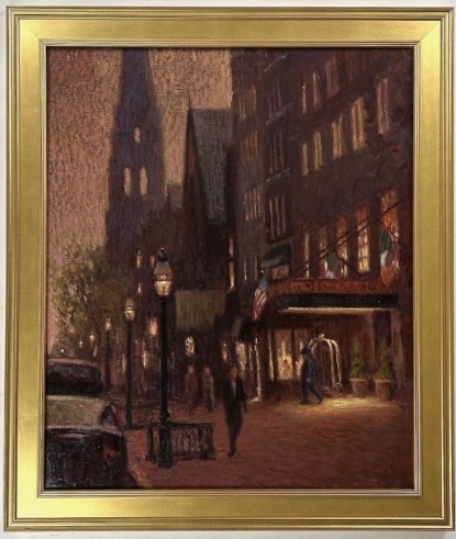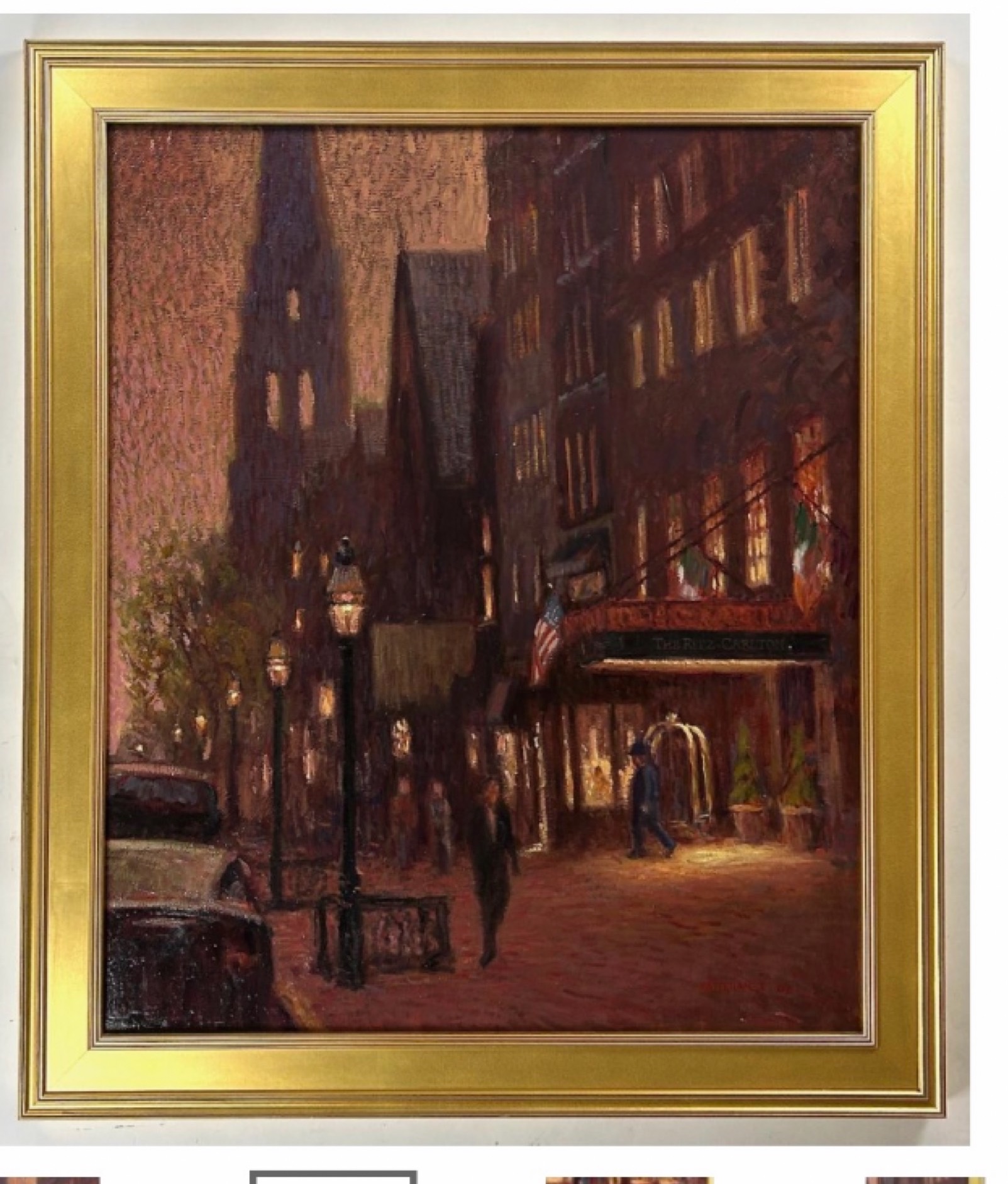 Vince Castellanet's oil painting captures an urban Boston streetscape centered on the iconic Ritz Carlton hotel located on prestigious Newbury Street. The work demonstrates the artist's characteristic attention to architectural detail and atmospheric light, rendered through confident brushwork typical of contemporary representational painting. Castellanet's composition balances the grandeur of the historic building with the everyday vitality of the street scene, creating a vivid record of this recognizable urban landmark.