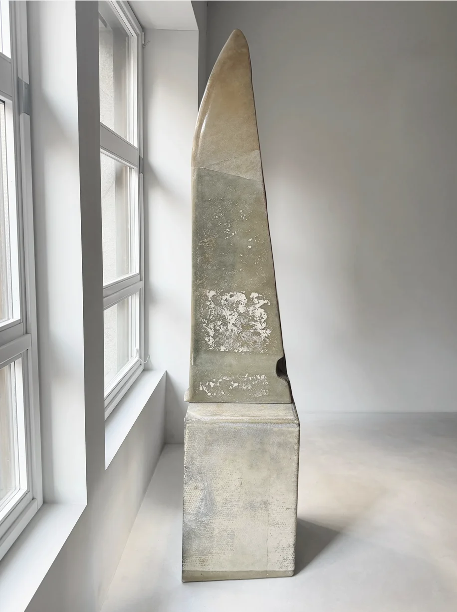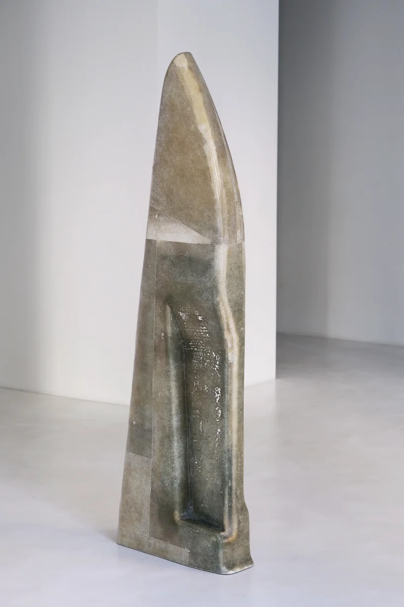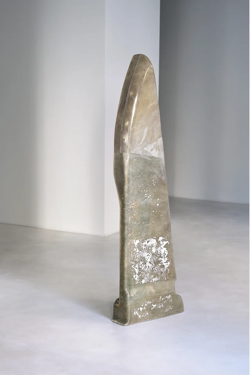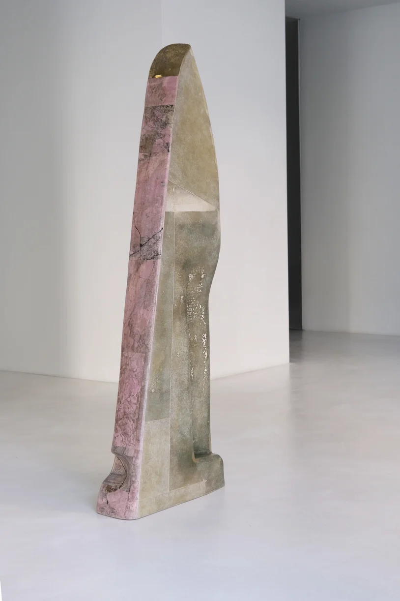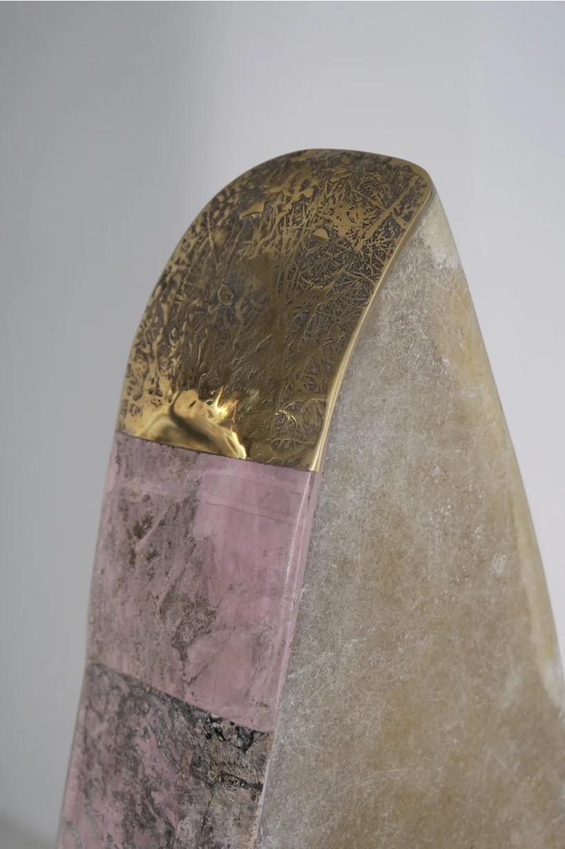 This sculptural work combines cast brass with hand-painted recycled fiberglass and stone, creating a dialogue between industrial materials and artisanal intervention. De Cotiis merges raw, found elements with refined metalwork to generate forms that occupy the boundary between refined craftsmanship and material authenticity. The hand-painted surface adds gestural warmth to the geometric brass structure. The use of recycled fiberglass demonstrates an ecological consciousness while maintaining formal sophistication. This piece exemplifies contemporary sculptural practice that honors material honesty and sustainable creative processes.
