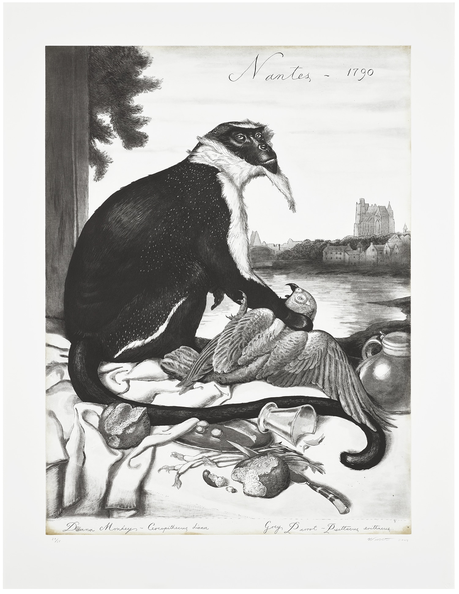 Walton Ford's Nantes is an etching, aquatint, and drypoint in colors on Somerset Satin paper. The work demonstrates mastery of traditional printmaking techniques combined with contemporary subject matter.