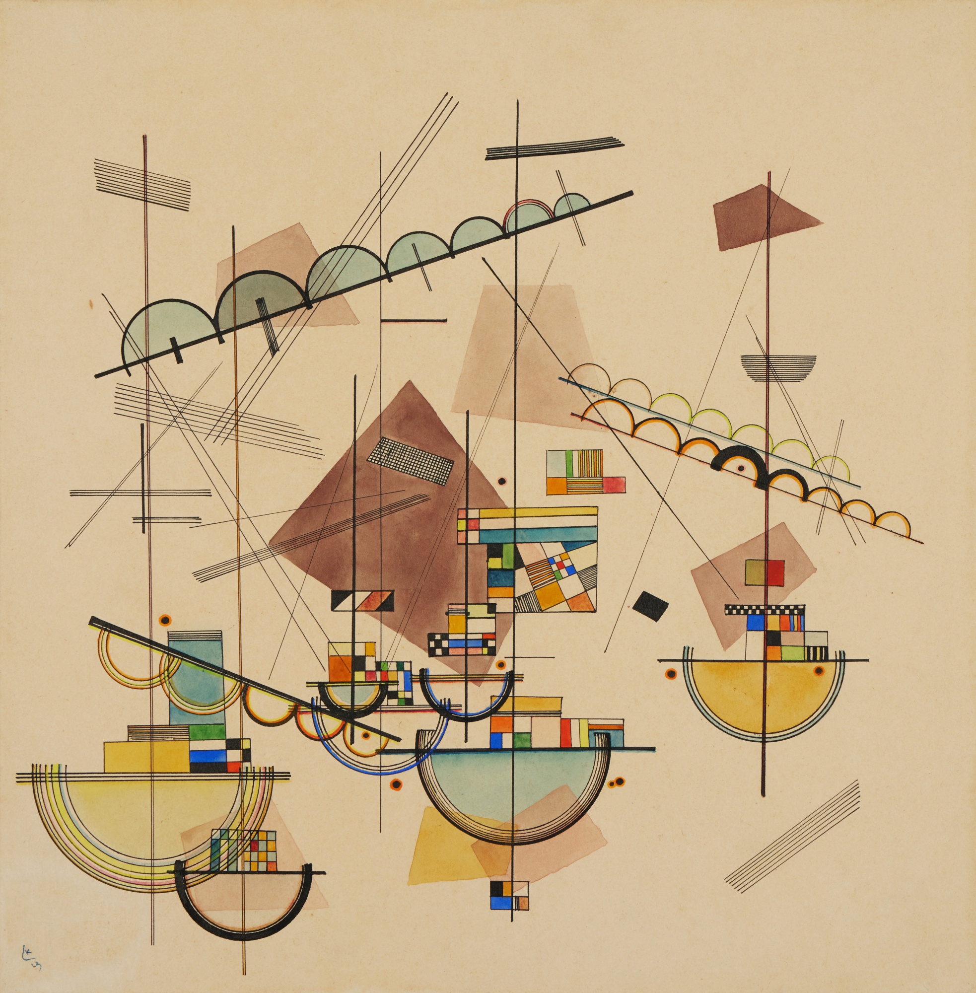 A mixed media work on paper combining gouache, watercolor, and pen and ink to create a lyrical composition. The piece demonstrates Kandinsky's exploration of color and line as independent expressive elements.