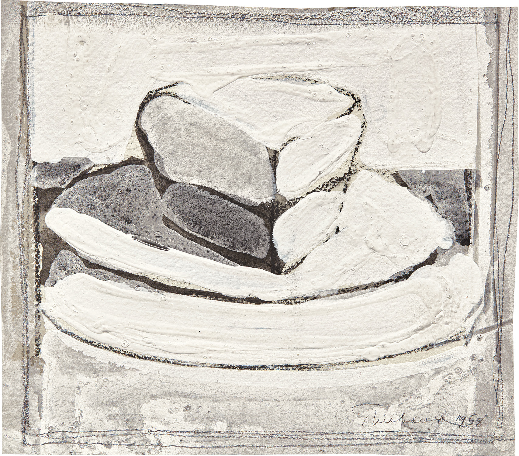 A single slice of pie sits in quiet isolation against a plain background, rendered with Wayne Thiebaud's signature thick, luscious paint application that makes the subject appear almost edible. Working in gouache, watercolor, wax crayon, and graphite, Thiebaud captures the humble dessert with bold, graphic simplicity, emphasizing light and shadow through creamy, tactile strokes. The work reflects his enduring fascination with everyday American food culture, elevating an ordinary diner staple into a object of painterly contemplation.