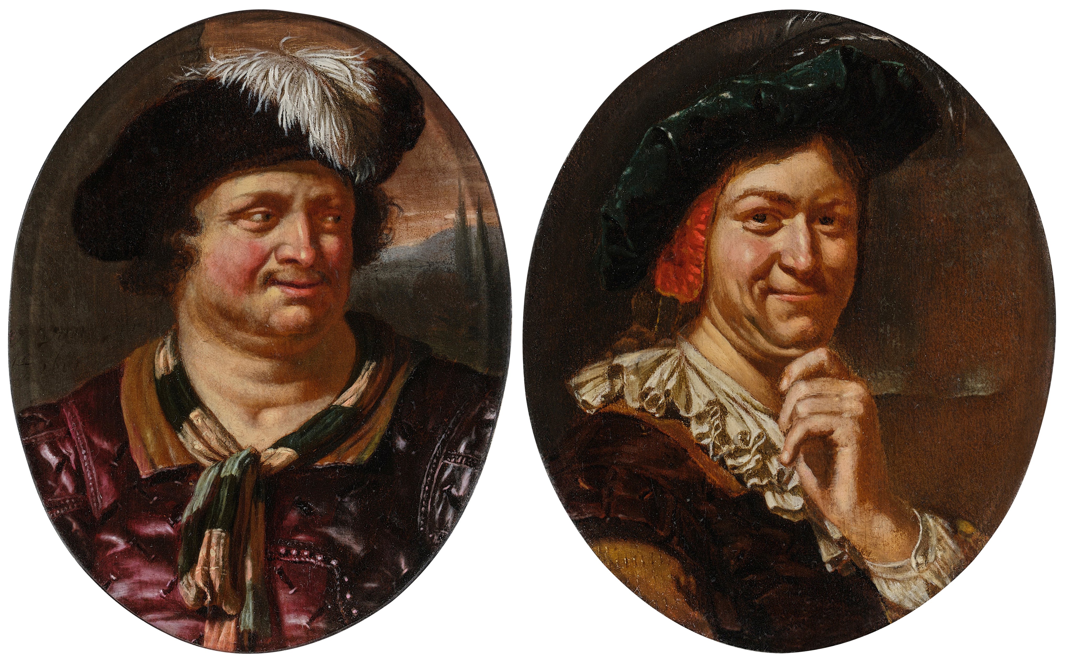 Willem van Mieris created a pair of portrait paintings in oil on panel depicting men wearing feathered hats and berets. These works exemplify Dutch Golden Age portraiture with meticulous attention to fabric textures and facial detail.