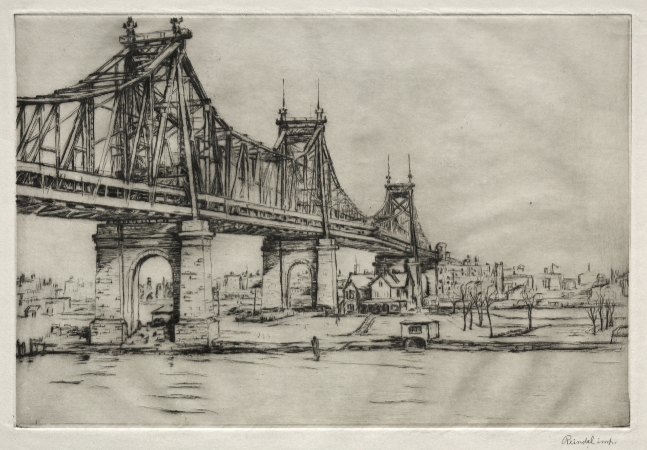 Capturing the industrial grandeur of New York's iconic span, the drypoint technique creates bold, expressive lines that emphasize the bridge's monumental steel structure against the urban landscape.