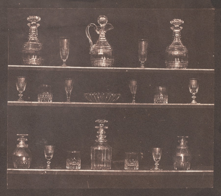 One of the earliest photographic still lifes, demonstrating Talbot's pioneering calotype process through the careful arrangement of glassware that showcases the medium's ability to capture transparent materials and subtle tonal gradations.