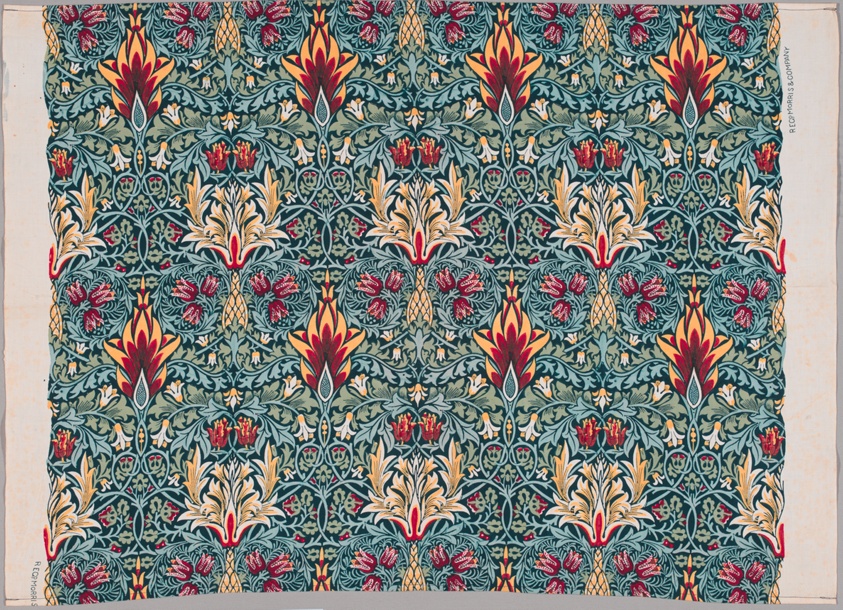 This pattern was first produced in collaboration with dye chemist Thomas Wardle (English, 1831–1909) in 1877, after three months of experimentation. Wardle’s company continued to print selected Morris patterns, and when Thomas died in 1909, his son Bernard maintained this relationship. Unlike woven textiles, the printed textiles are marked with Morris & Co.’s logo on their selvages (outer edges), and the different styles of the typeface offer clues to when a fabric was actually made. The selvages of this example indicate that it was made some time between 1925 and 1940.