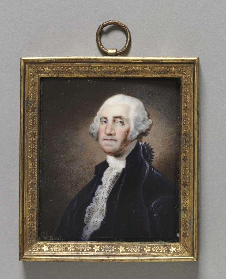 Executed in the refined medium of enamel painting, this miniature portrait exemplifies the neoclassical idealization of America's first president during the early republic period.