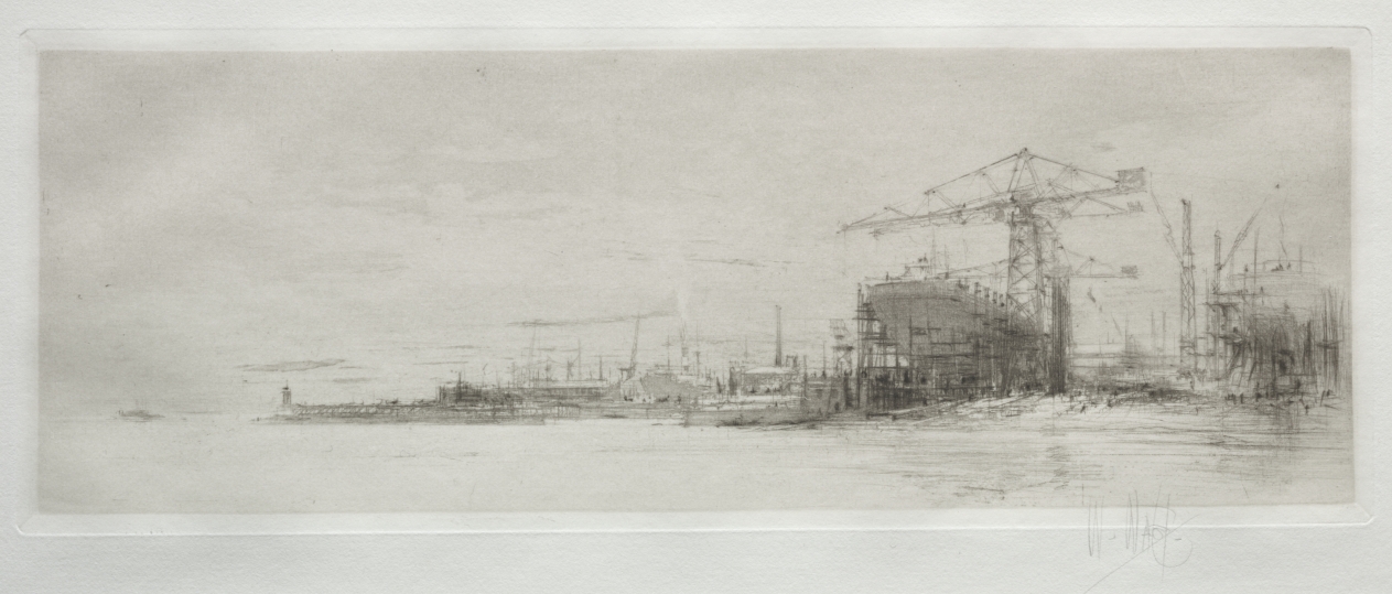 Glasgow's River Clyde receives Walcot's artistic attention in this drypoint from his systematic documentation of Britain's most important waterways.