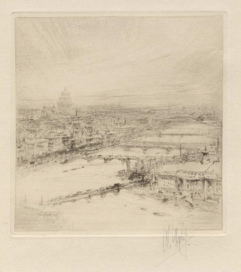 William Walcot's "London" is an etching and drypoint executed in brown ink that captures the atmospheric quality of the city through the artist's skilled use of plate tone. Walcot, known for his architectural and urban scenes, employs the combination of etching and drypoint techniques to create varied tonal effects and textural details that evoke the mood and character of London's landscape. The retention of plate tone across the print adds warmth and depth to the composition, characteristic of Walcot's sophisticated printmaking approach.