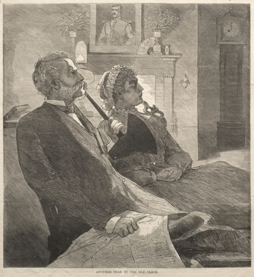 "Another Year by the Old Clock" is a wood engraving by American artist Winslow Homer that depicts a contemplative domestic scene with characteristic attention to light and narrative detail. The work exemplifies Homer's skill in the demanding medium of wood engraving, where he captures intimate moments of everyday life with both technical precision and emotional resonance. Created during Homer's prolific period as a printmaker, the engraving reflects his interest in exploring themes of time, aging, and the passage of seasons through carefully observed human subjects.
