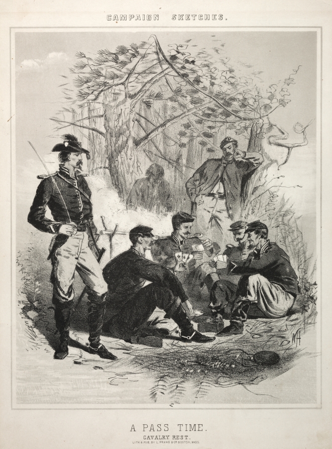 Soldiers' downtime between battles is observed with documentary realism in this lithograph, contributing to Homer's comprehensive visual record of Civil War military life.