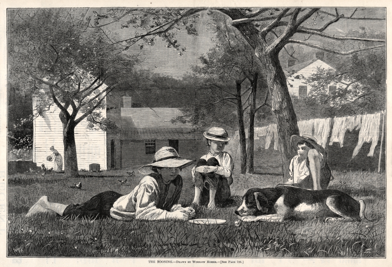 Depicting rural workers at rest, this wood engraving exemplifies Homer's sympathetic portrayal of agricultural labor and the rhythms of farm life.