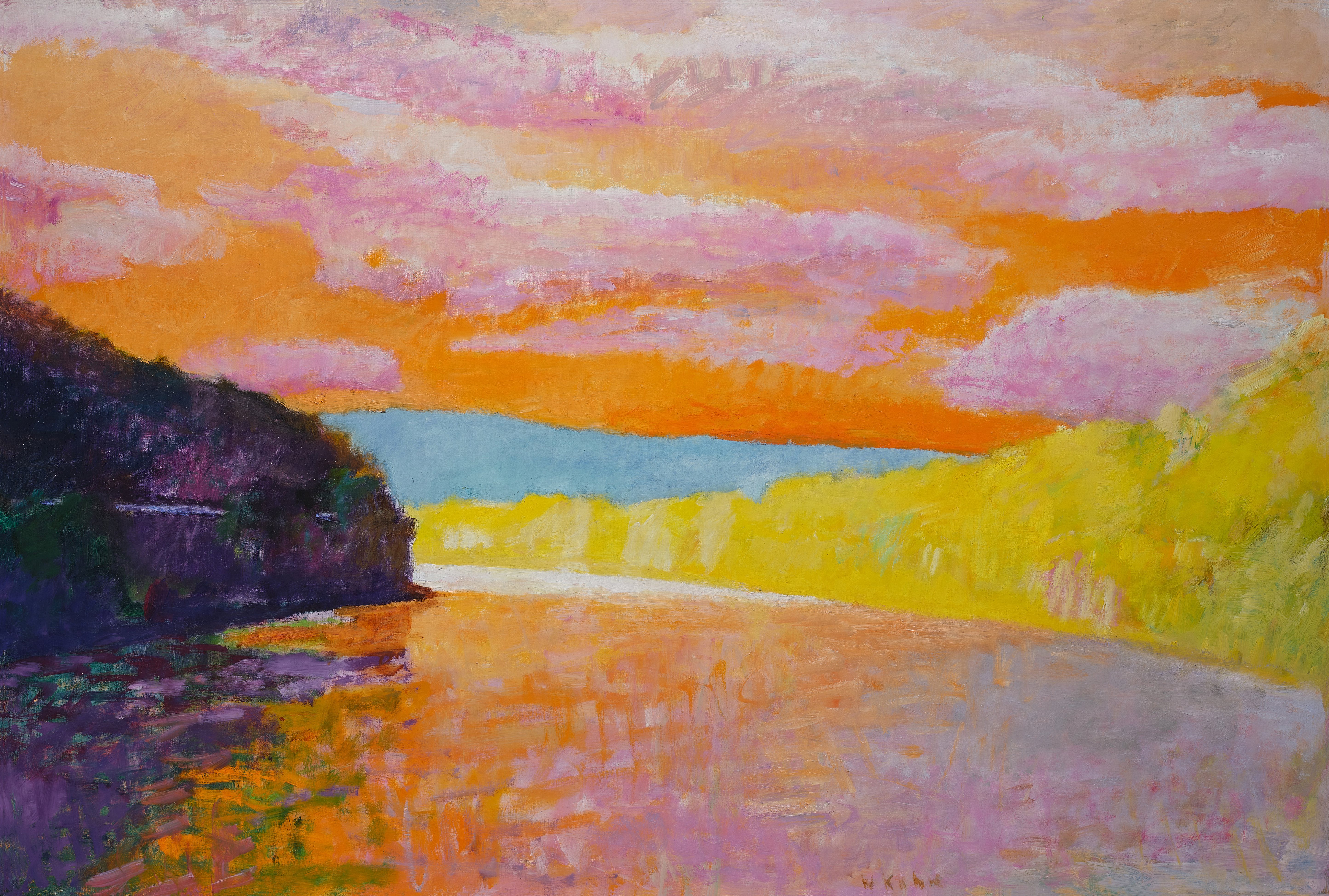 Wolf Kahn's Orange Sky, Orange River (1991) is an oil painting celebrating the vibrant chromatic relationships found in landscape. The work demonstrates Kahn's mastery of color harmony and his ability to capture the essence of natural phenomena through bold, expressive brushwork.