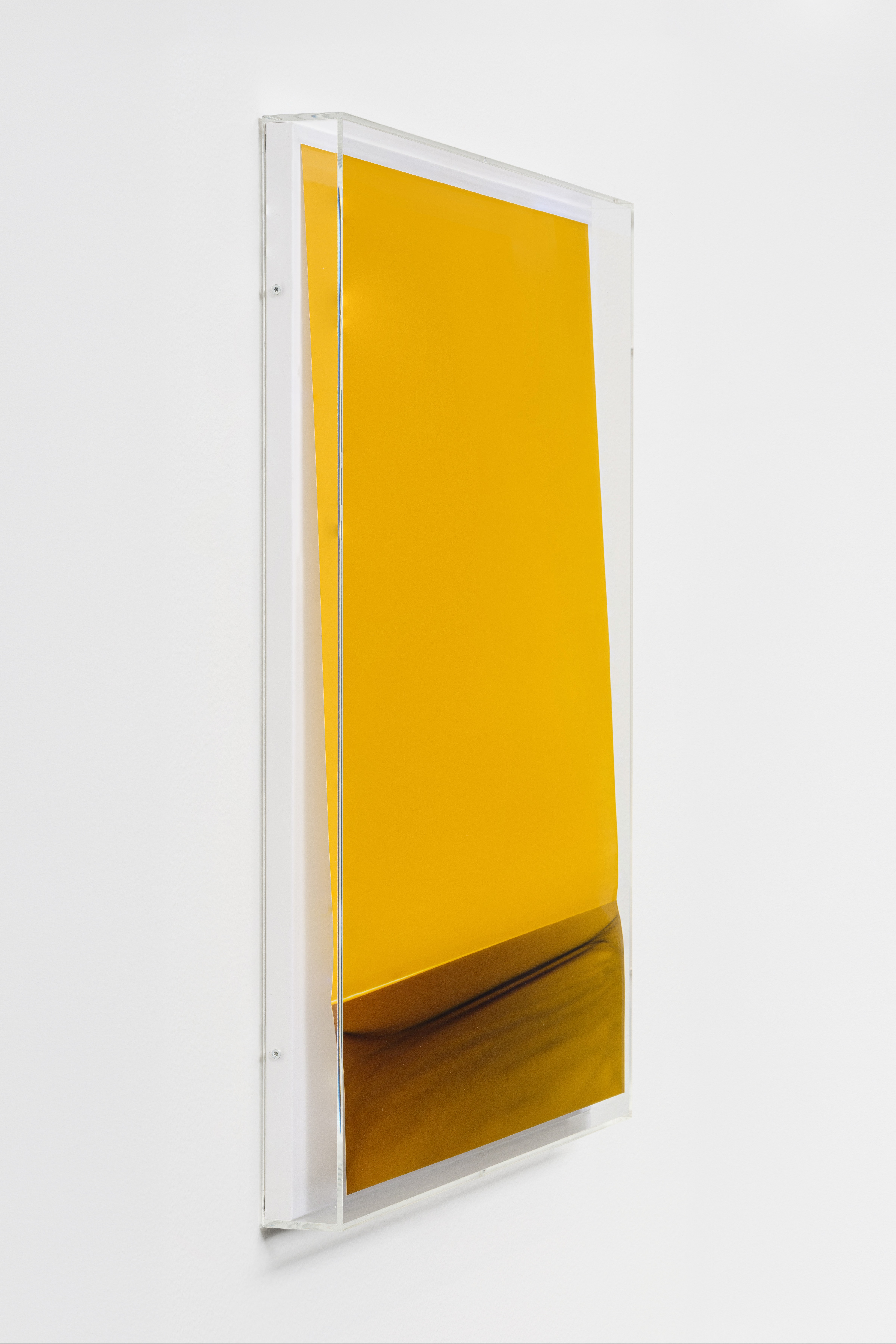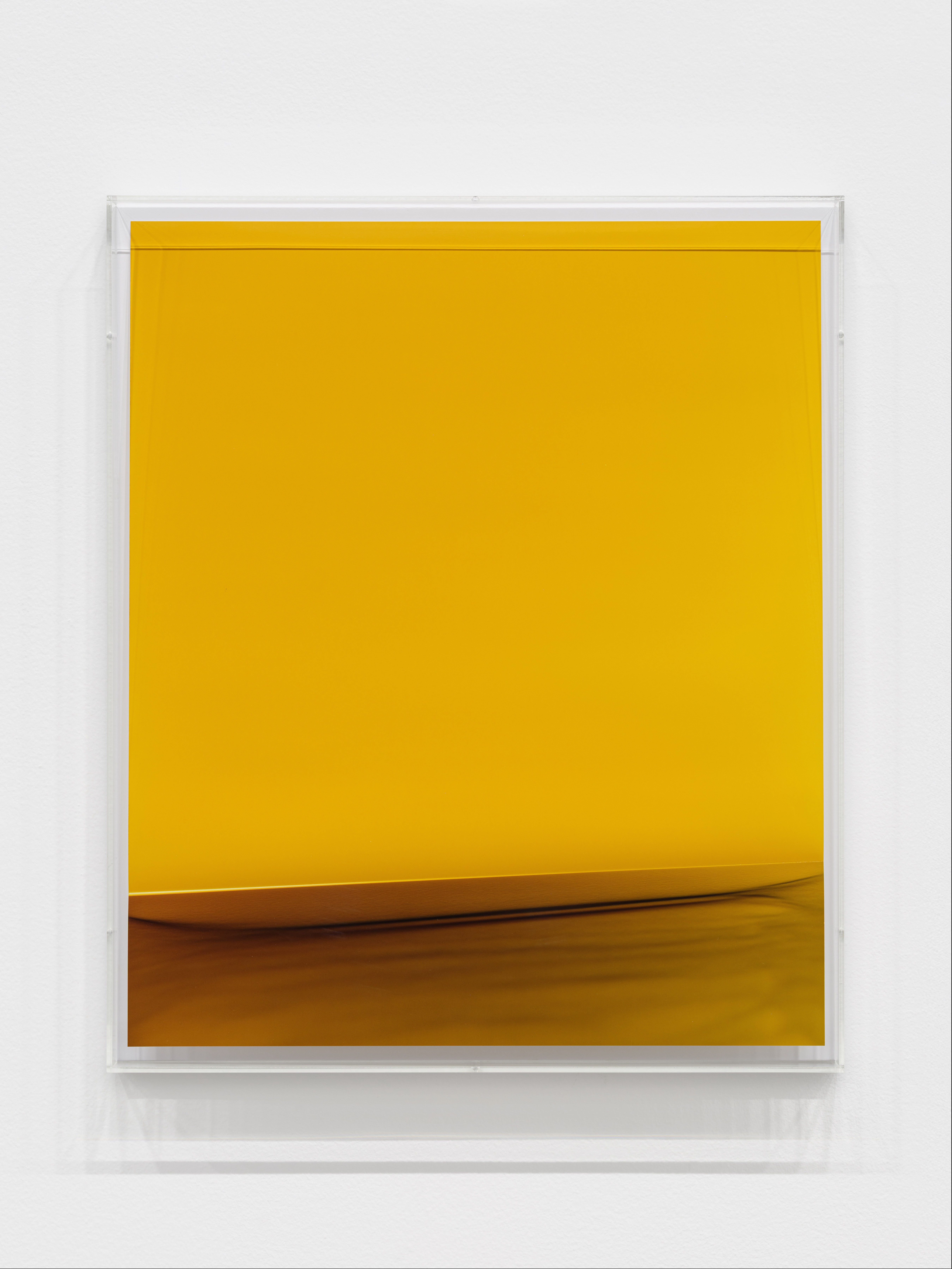 A large-format chromogenic print by Wolfgang Tillmans presenting an immersive field of saturated golden yellow, characteristic of his abstract 'Freischwimmer' or paper-drop series in which photographic paper is exposed to light without a camera. The lower portion reveals a subtle curved shadow and tonal gradient, suggesting a curled or draped sheet of photosensitive paper. The work is presented in Tillmans' signature clear acrylic artist's frame, which is itself considered part of the artwork. This piece exemplifies Tillmans' ongoing investigation of the materiality and physical properties of the photographic medium.