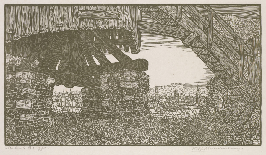Printed in atmospheric dark green ink, this woodcut demonstrates Nieuwenkamp's mastery of the medium and his eye for picturesque European architecture. The artist's extensive travels through Europe and Asia informed his printmaking, which often emphasized the romantic qualities of historic buildings and landscapes.
