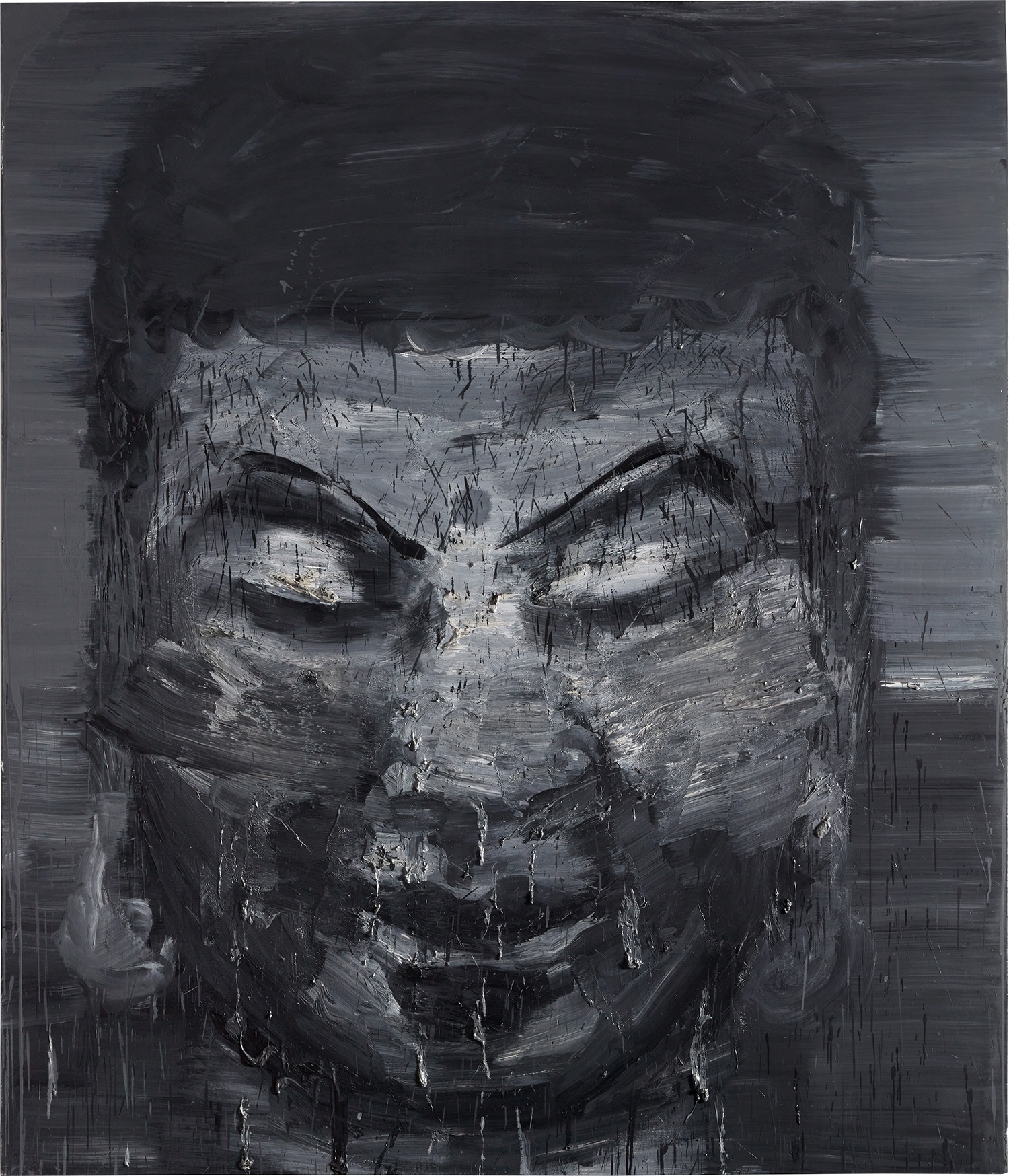 A monumental figure emerges from turbulent, gestural brushwork, rendered in Ming's signature limited palette of grays, blacks, and whites. The Buddha form dissolves into the paint itself, simultaneously present and absent, as thick, expressive strokes both construct and obscure the sacred image. Ming's visceral painting technique transforms the spiritual icon into a meditation on visibility, faith, and the limits of representation.