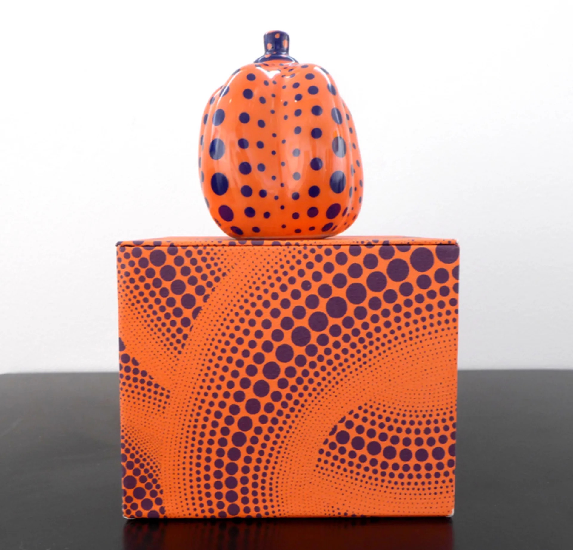 Yayoi Kusama's 'Pumpkin (Limoges)' is a complete set of five porcelain multiples painted and glazed, each housed in original paper-covered boxes with fabric lining. The work demonstrates Kusama's exploration of mass production and her iconic pumpkin motif across decorative arts.